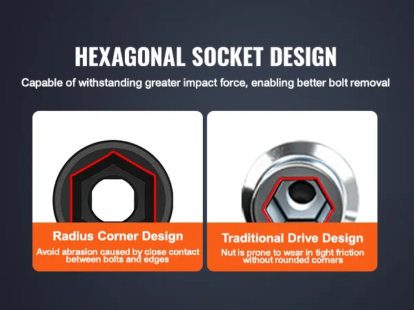 The hexagonal socket design creates a gap between the nut and the edges during operation, preventing excessive friction and wear. It can withstand greater impact force and effectively remove bolts.