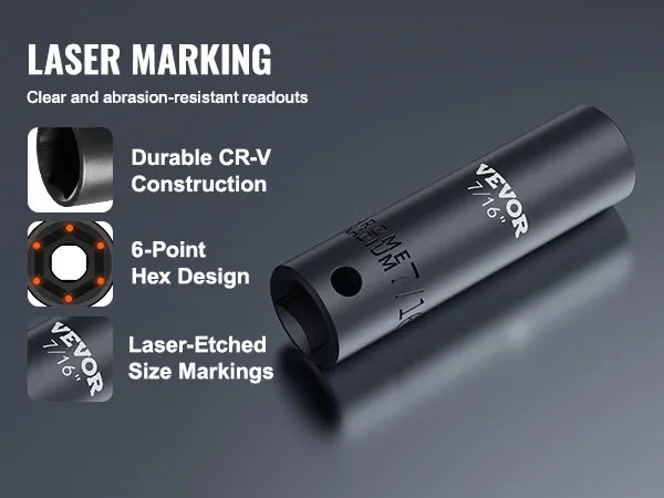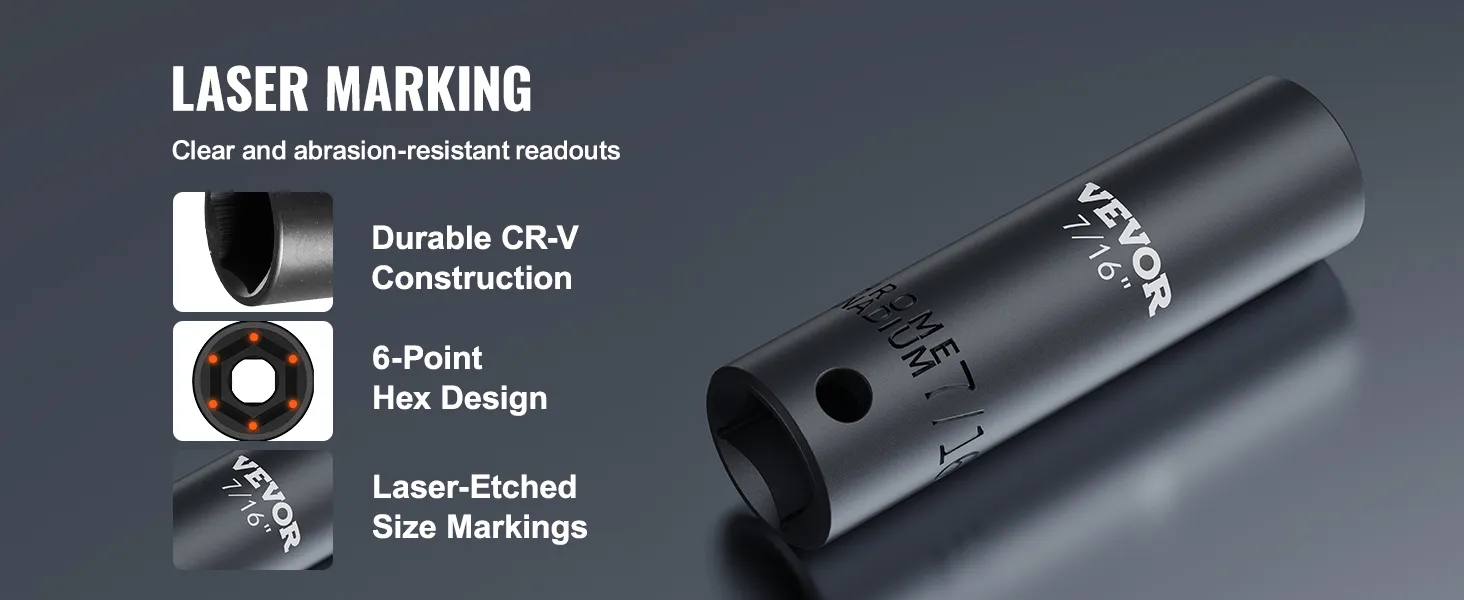 Using laser etching and rolling processes, the extra-large size markings on the sockets are clear and easy to identify even under various lighting conditions. The markings are also resistant to wear.