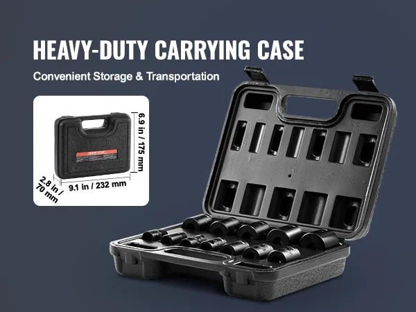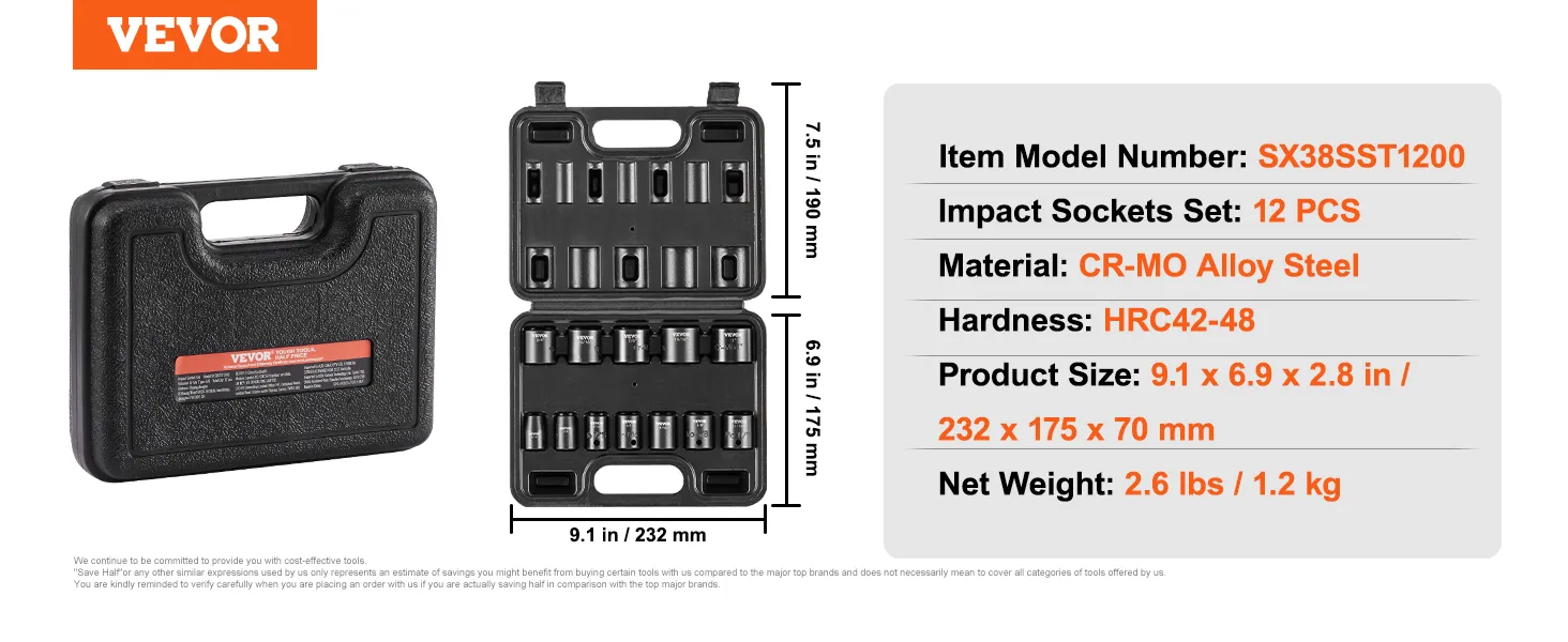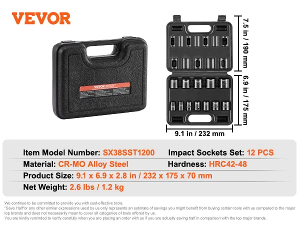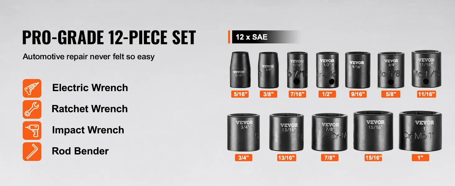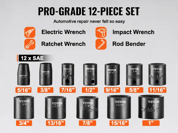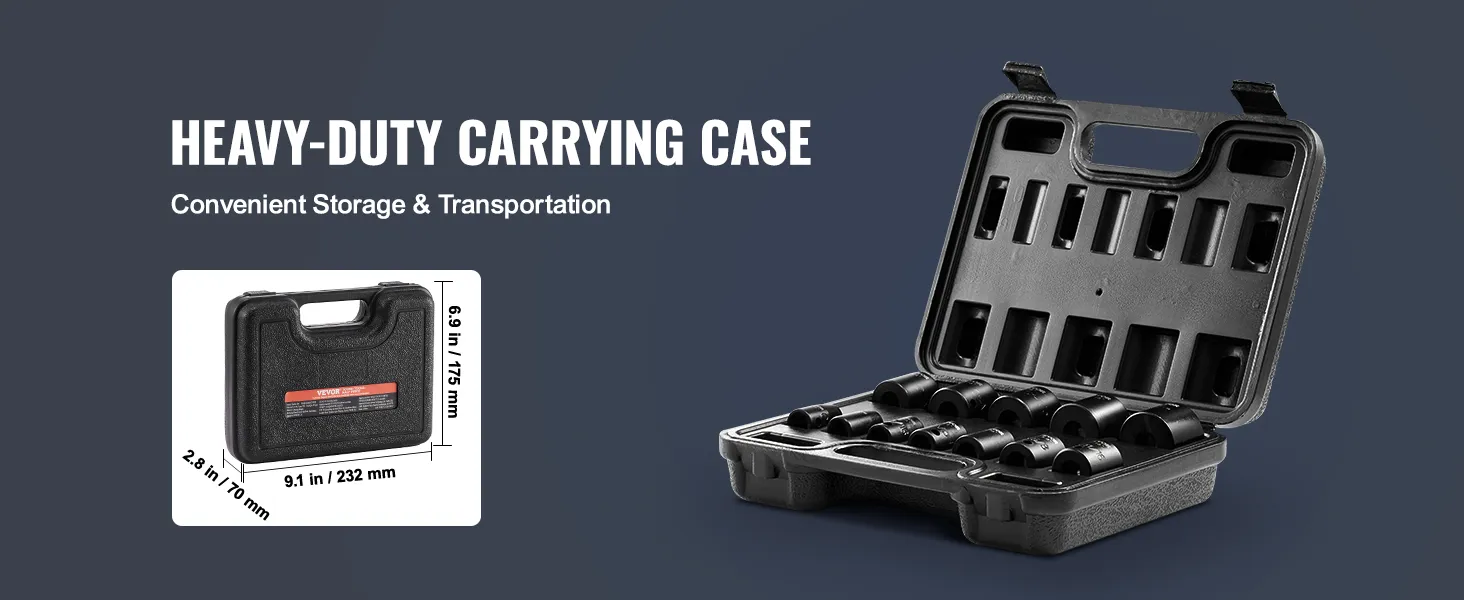 Are you looking for a professional and portable set of impact sockets? VEVOR's 12-piece impact socket set offers a complete range of tools, especially suitable for repairing different brands of automobiles.