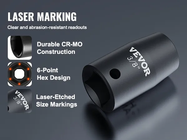 Cr-Mo Industrial-Grade Alloy Steel: Crafted from premium impact-grade alloy steel, our 3/8" impact socket set with Cr-Mo industrial-grade alloy steel offers exceptional enhancements in impact resistance and absorption. Through the utilization of vacuum heat treatment, the steel undergoes rapid heating and cooling processes, resulting in a polished and highly durable surface. This makes it well-suited for a wide range of operational environments.