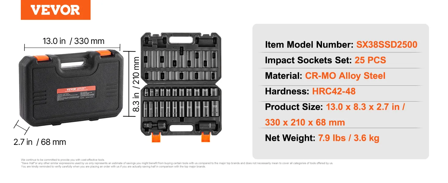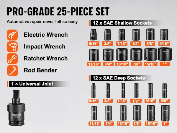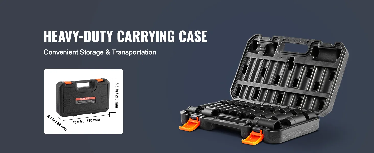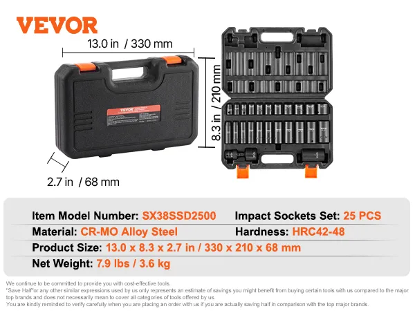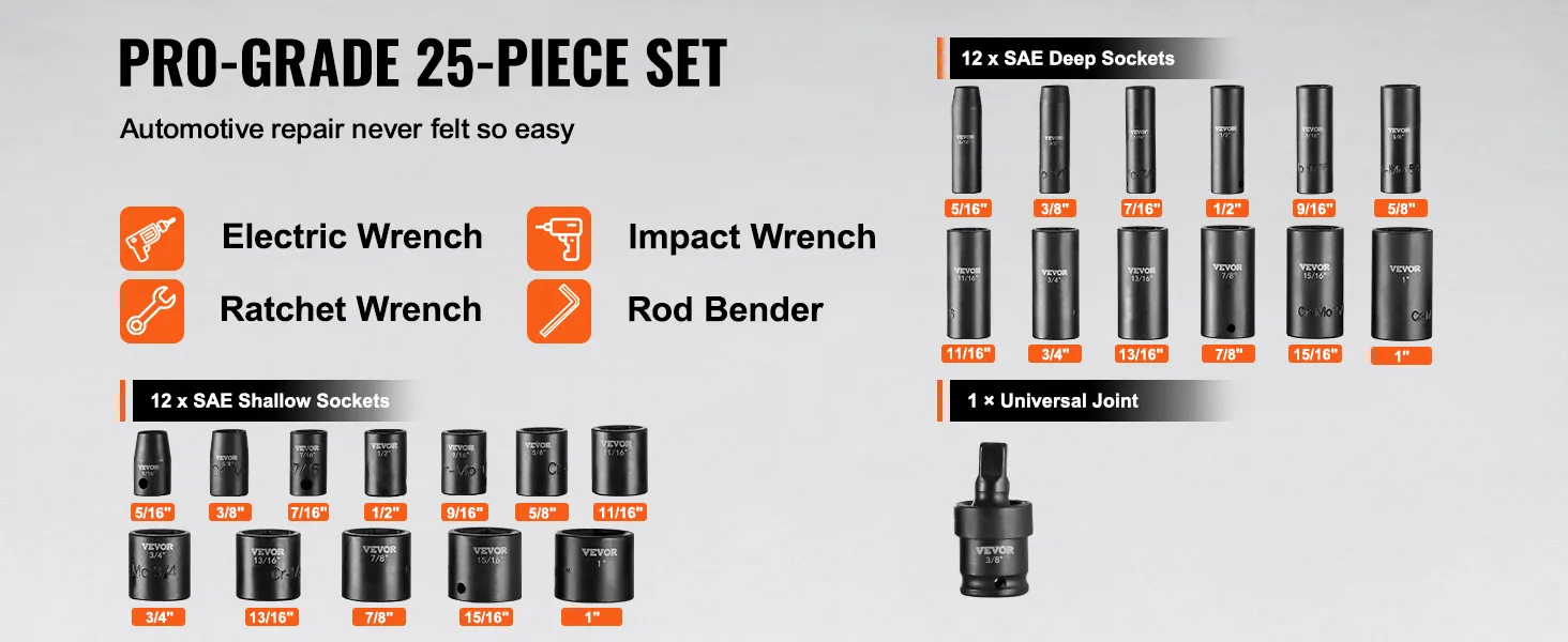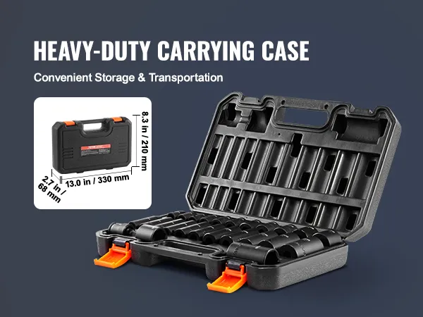 Are you looking for a professional and portable set of impact sockets? VEVOR's 25-piece impact socket set offers a complete range of tools, especially suitable for repairing different brands of automobiles.