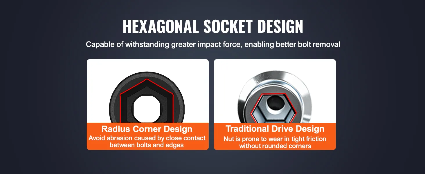 The hexagonal socket design creates a gap between the nut and the edges during operation, preventing excessive friction and wear. It can withstand greater impact force and effectively remove bolts.