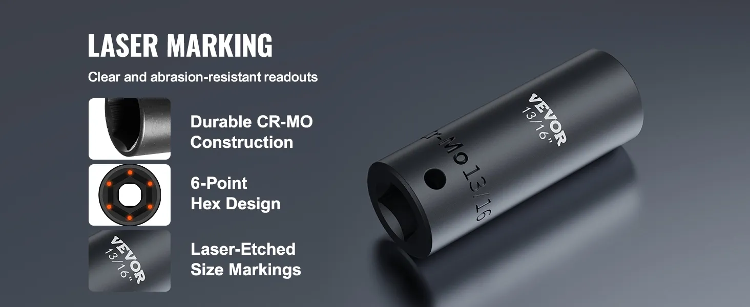 Using laser etching and rolling processes, the extra-large size markings on the sockets are clear and easy to identify even under various lighting conditions. The markings are also resistant to wear.