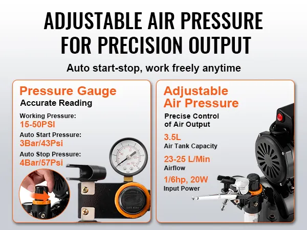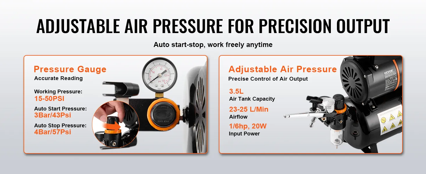 Superior Atomization Effect: The 3.5L large air storage tank of the air brush set ensures more stable air pressure output and perfect atomization effect. The adjustable air pressure can be precisely set to your required level, achieving different spraying effects. It automatically stops at a certain pressure, making it safer to use.