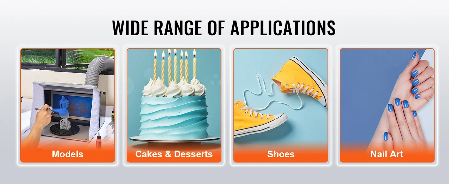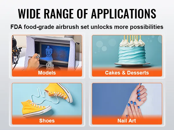 The air brush painting set is FDA food-safe certified, making it suitable for food preparation such as cakes and desserts, ensuring safety for kids. You can also use it for model painting, nail art, makeup spraying, graffiti painting, and body makeup.
