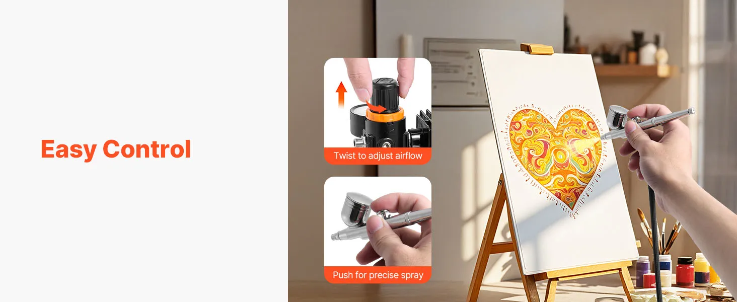 Fácil control, diseño ideal para principiantes: Este kit de aerógrafo con compresor incluye un aerógrafo de doble acción para controlar el aire y la pintura de forma independiente. La perilla de presión ajustable garantiza una pulverización suave y uniforme, fácil incluso para principiantes.