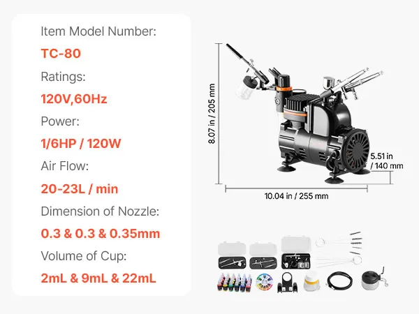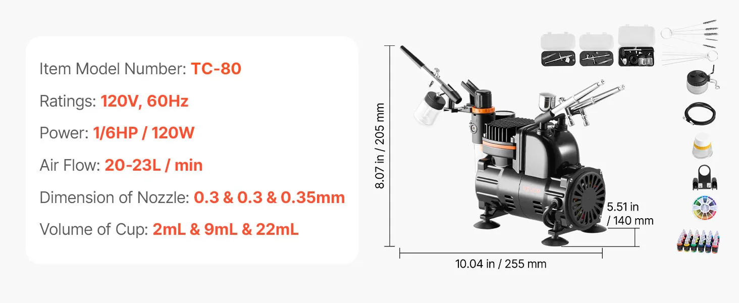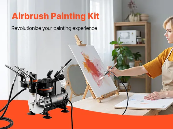 Kit de aerógrafo VEVOR de 1/6 HP con compresor, 3 aerógrafos profesionales de doble acción con 3 puntas, manguera, pintura acrílica y pincel, silencioso, para decoración de tartas, modelismo y manicura.