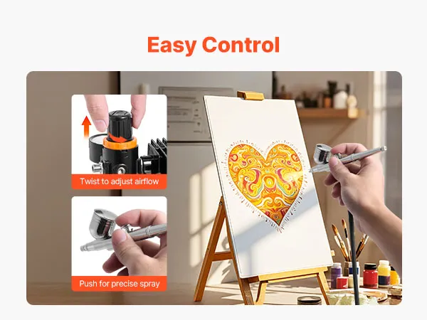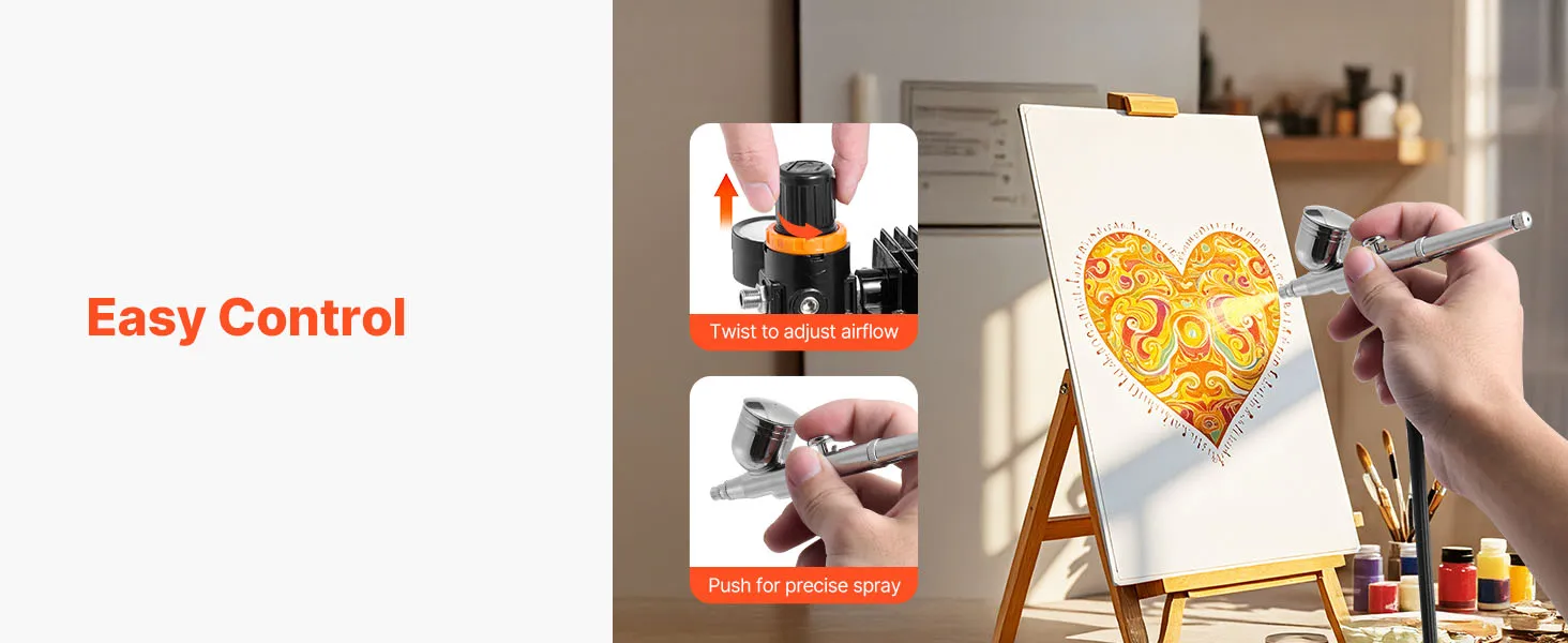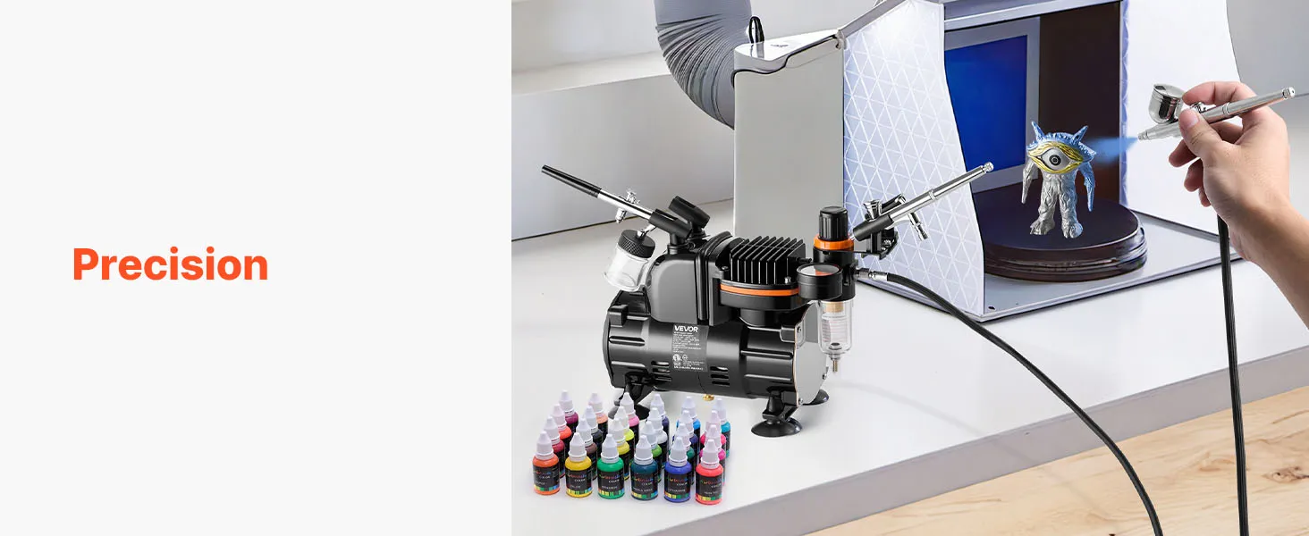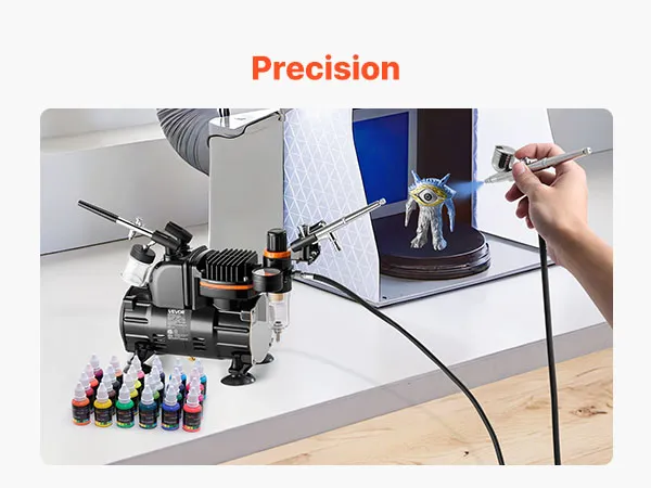 Funcionamiento silencioso: El kit de aerógrafo con compresor funciona silenciosamente incluso durante un uso prolongado, lo que te ayuda a concentrarte en tu arte. Ya sea en el estudio o en casa, disfruta de un ambiente tranquilo y creativo que deja fluir tus ideas.