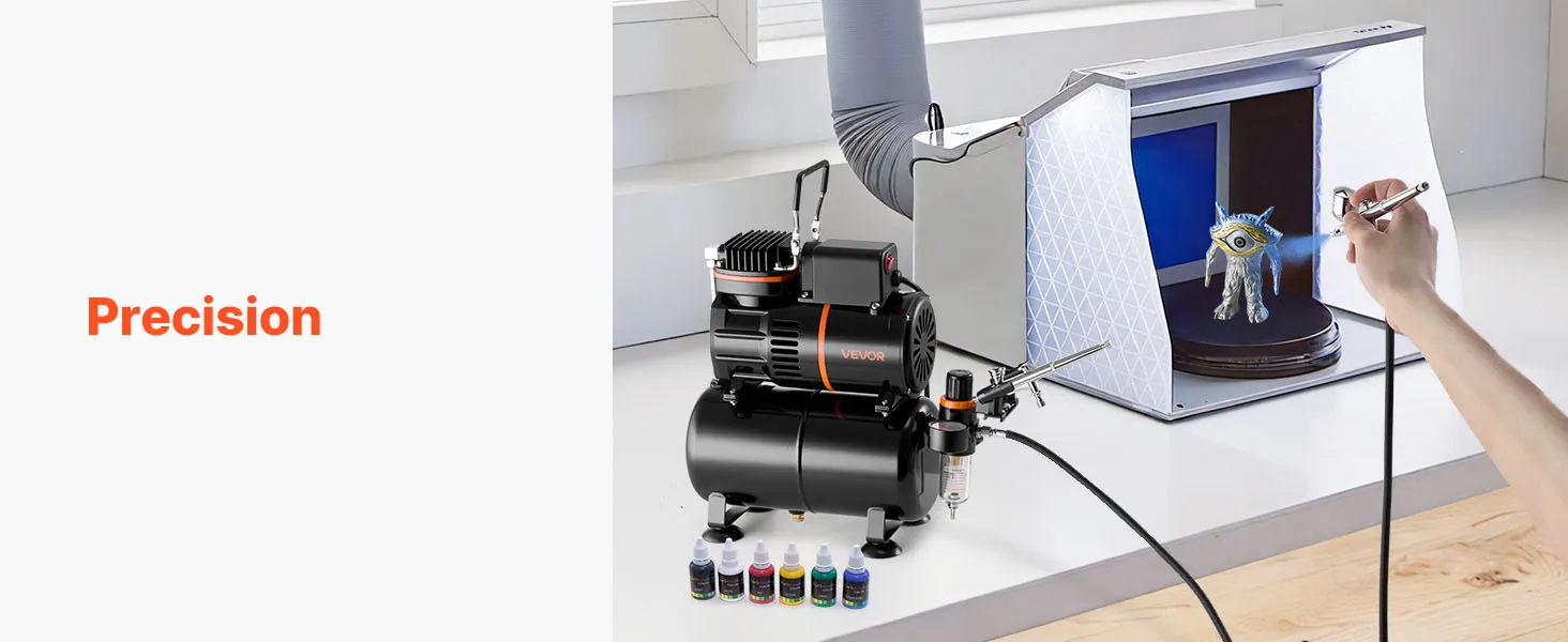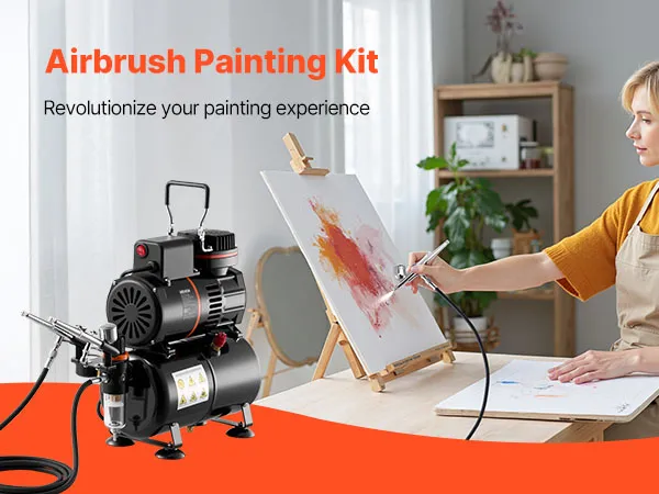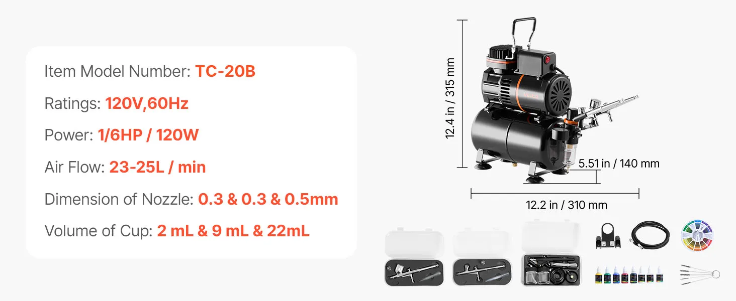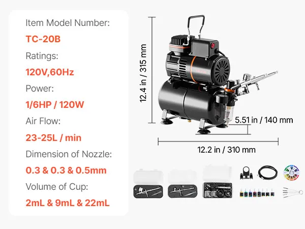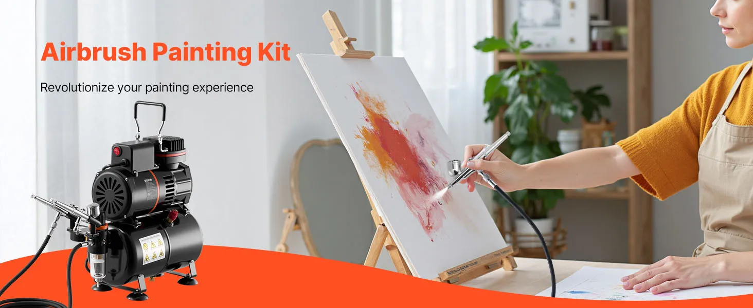 Kit de aerógrafo VEVOR de 1/6 HP con compresor y tanque, 3 aerógrafos profesionales de doble acción con 3 boquillas, manguera, pintura acrílica y 2 ventiladores para decoración de tartas, modelismo y manicura.