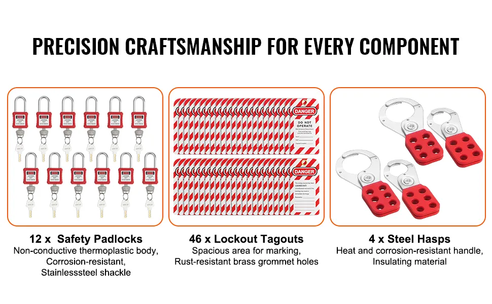 Este kit de bloqueo eléctrico viene con 12 candados de seguridad, 4 cerrojos, 46 etiquetas de bloqueo, 46 bridas para cables de nailon, 1 bloqueo de enchufe, 13 bloqueos de disyuntor, proporcionando una solución para prevenir riesgos eléctricos.