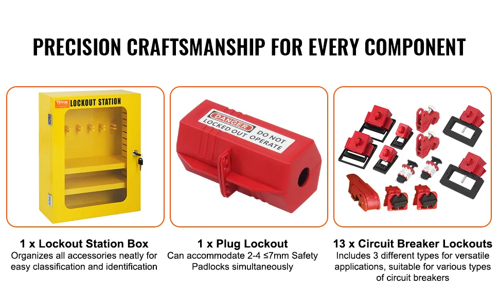 Múltiples bloqueos: las etiquetas de colores brillantes garantizan una alta visibilidad, con una superficie grabable para una fácil identificación y marcas borrables, lo que las hace reutilizables. Las resistentes bridas de nailon sujetan de forma segura las etiquetas, evitando caídas. Siete tipos de bloqueos de disyuntores son adecuados para varios disyuntores. El dispositivo de bloqueo de enchufe es adecuado para la mayoría de enchufes de 110 V a 125 V. Cumplen con las normas de OSHA, lo que mejora la seguridad en el lugar de trabajo.