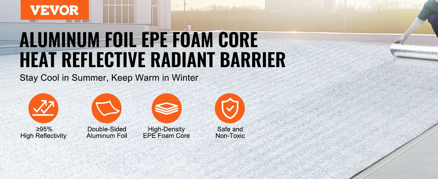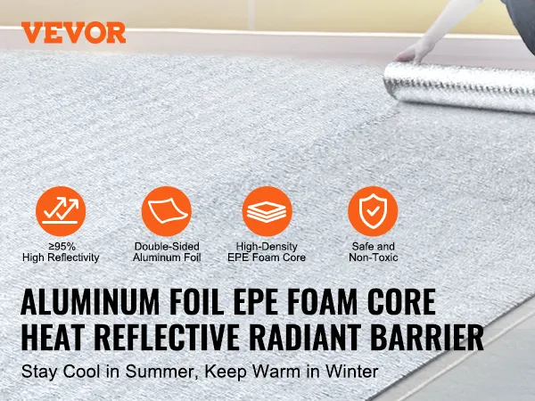 El rollo aislante de doble reflexión VEVOR presenta una reflectividad alta de ≥95 %, utiliza papel de aluminio de doble reflexión y un núcleo de espuma EPE de alta densidad. Bloquea eficazmente la luz solar en verano y evita la pérdida de calefacción en interiores en invierno, manteniendo una temperatura interior agradable.