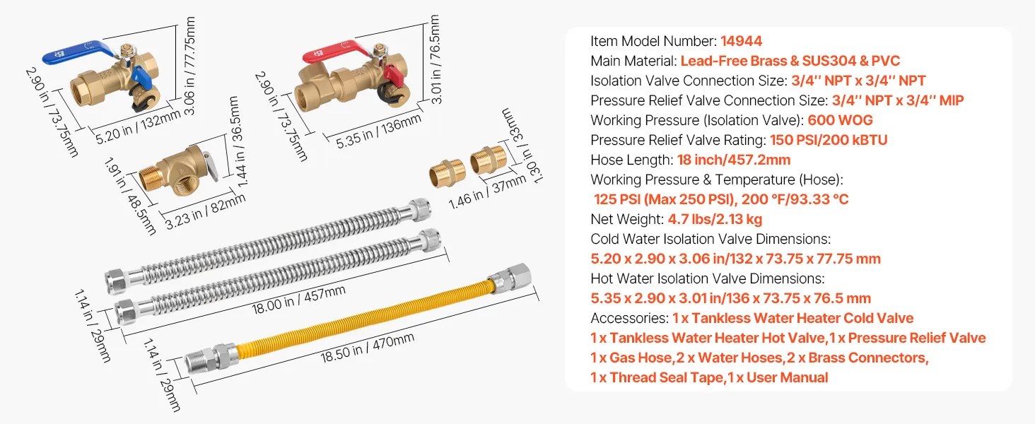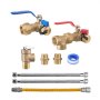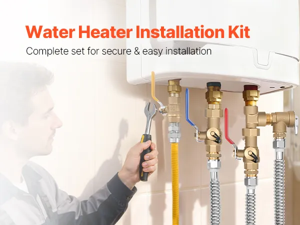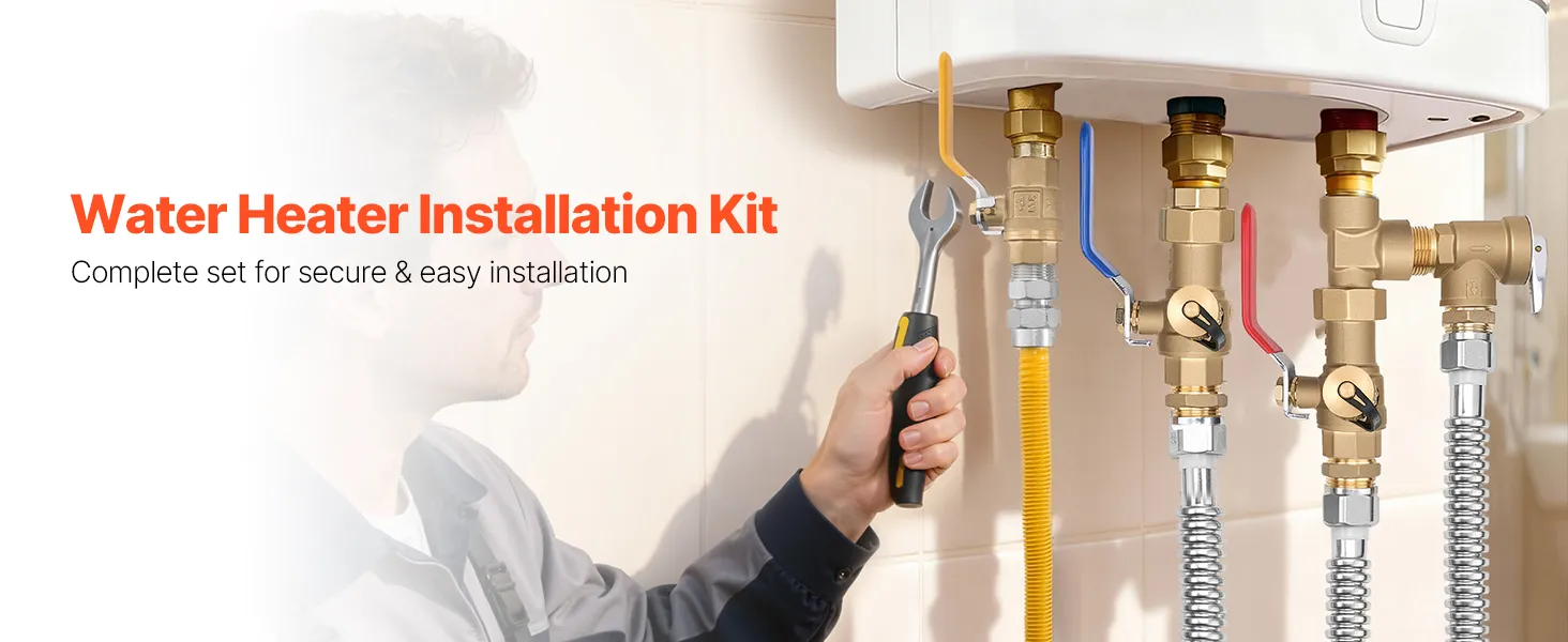 Kit de calentador de agua VEVOR, kit de reparación de plomería de agua fría y caliente de 3/4 de pulgada con válvulas de aislamiento WOG 600, válvula de alivio de presión, manguera de gas de doble capa, compatible con la mayoría de las marcas de calentadores de agua sin tanque.