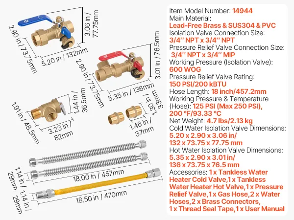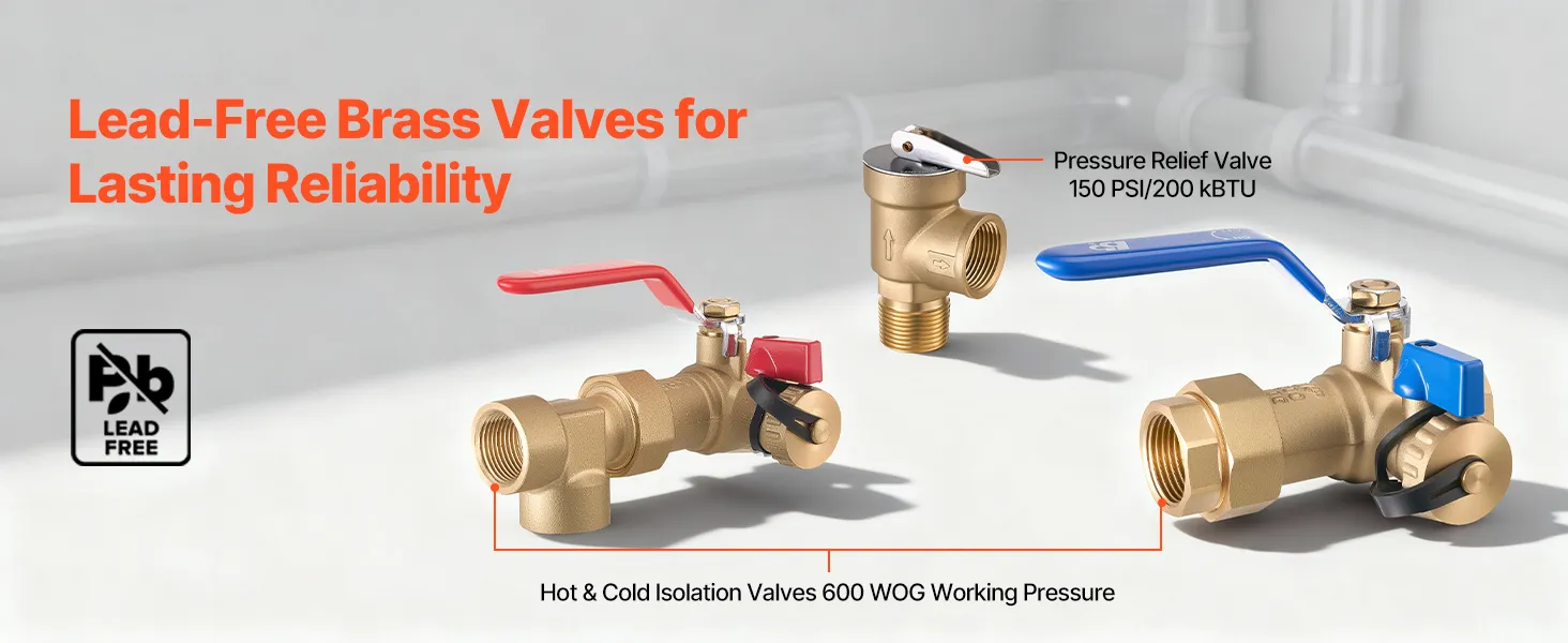 Todos los componentes esenciales en un solo kit: nuestra válvula de servicio de aislamiento para calentador de agua sin tanque incluye válvulas de aislamiento, una válvula de alivio de presión, mangueras, conectores de latón y cinta selladora de roscas. Fabricada con latón sin plomo y acero inoxidable SUS304 para un rendimiento duradero y sin fugas.
