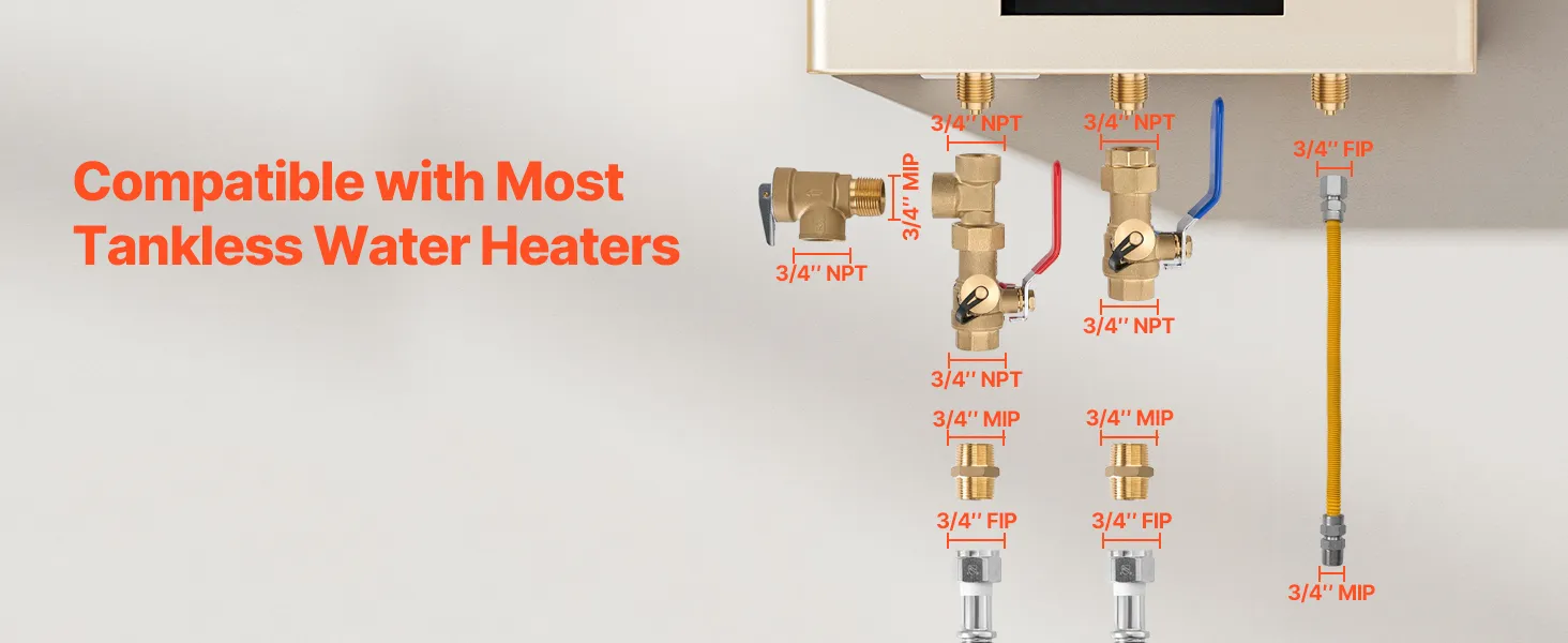 Diseñado con conexiones estándar de 3/4 pulg., este kit de válvula de servicio para calentador de agua sin tanque es compatible con la mayoría de los calentadores de agua sin tanque, lo que hace que la instalación sea más rápida y sencilla sin modificaciones adicionales.