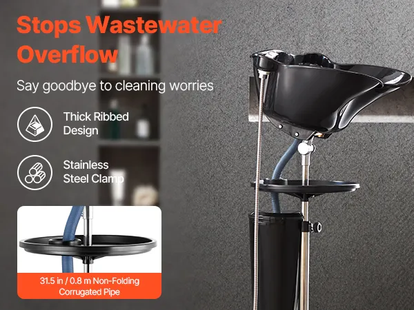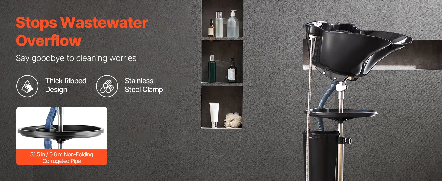 Non-Folding Corrugated Pipe: The portable salon sink features a 31.5 in/0.8 m non-folding corrugated pipe that is durable and not prone to whitening or damage. It is secured with thick ribs and stainless steel clamps to avoid leaks, ensuring smooth drainage.