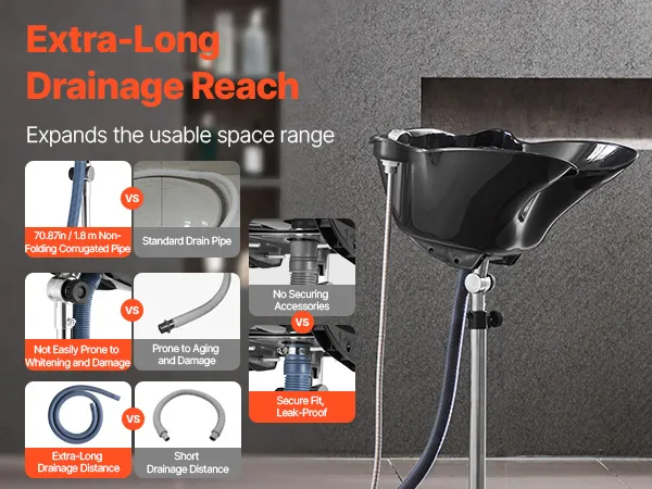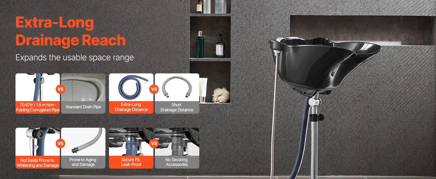 The portable salon sink comes with a 70.87 in/1.8m extended non-collapsible corrugated pipe, also durable and not prone to whitening or damage. This extension increases the drainage range, providing greater flexibility for your drainage needs.