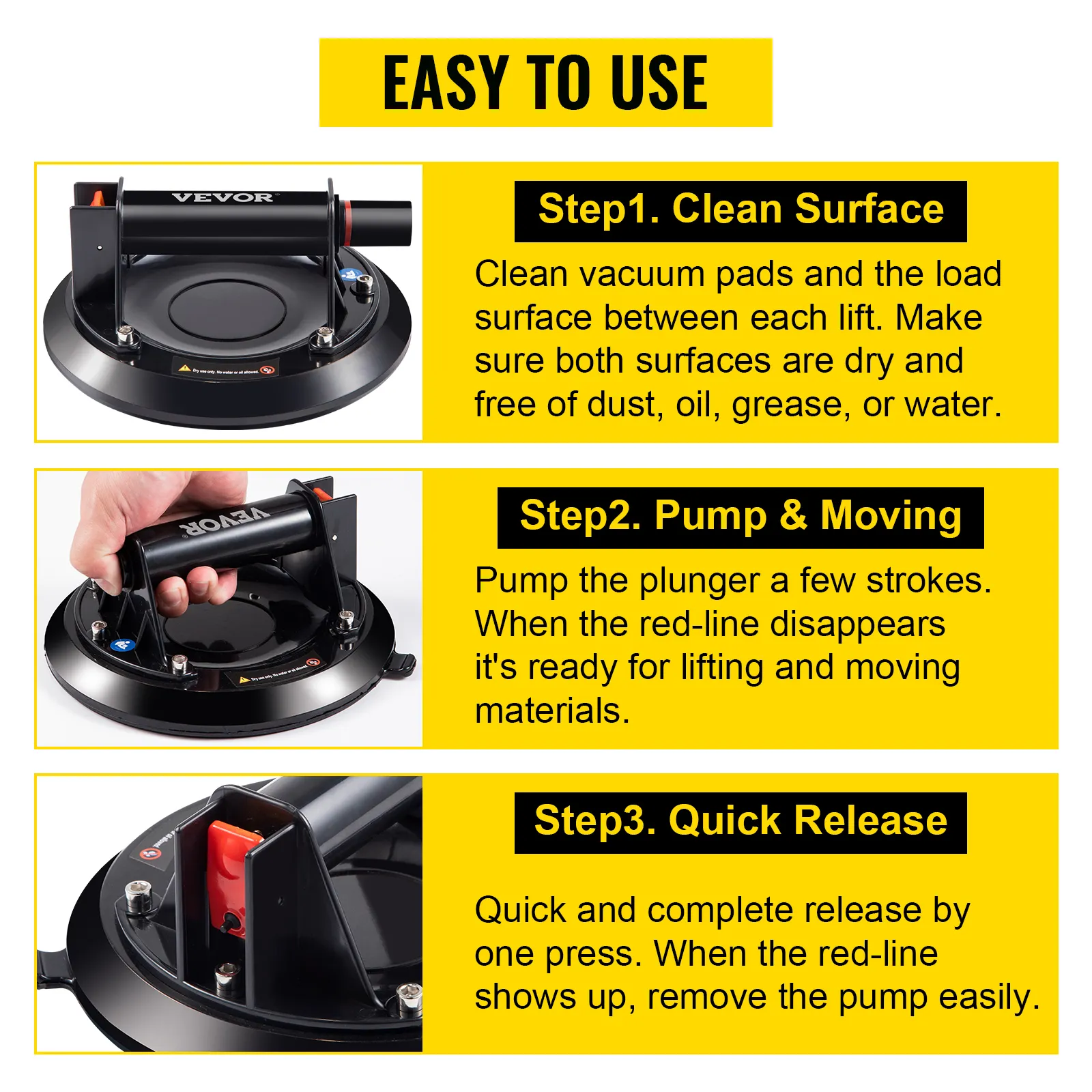 Es fácil usar esta ventosa de elevación de vidrio. Solo se necesitan tres pasos para succionar el objeto con fuerza: limpiar la superficie, bombear y mover, liberación rápida.