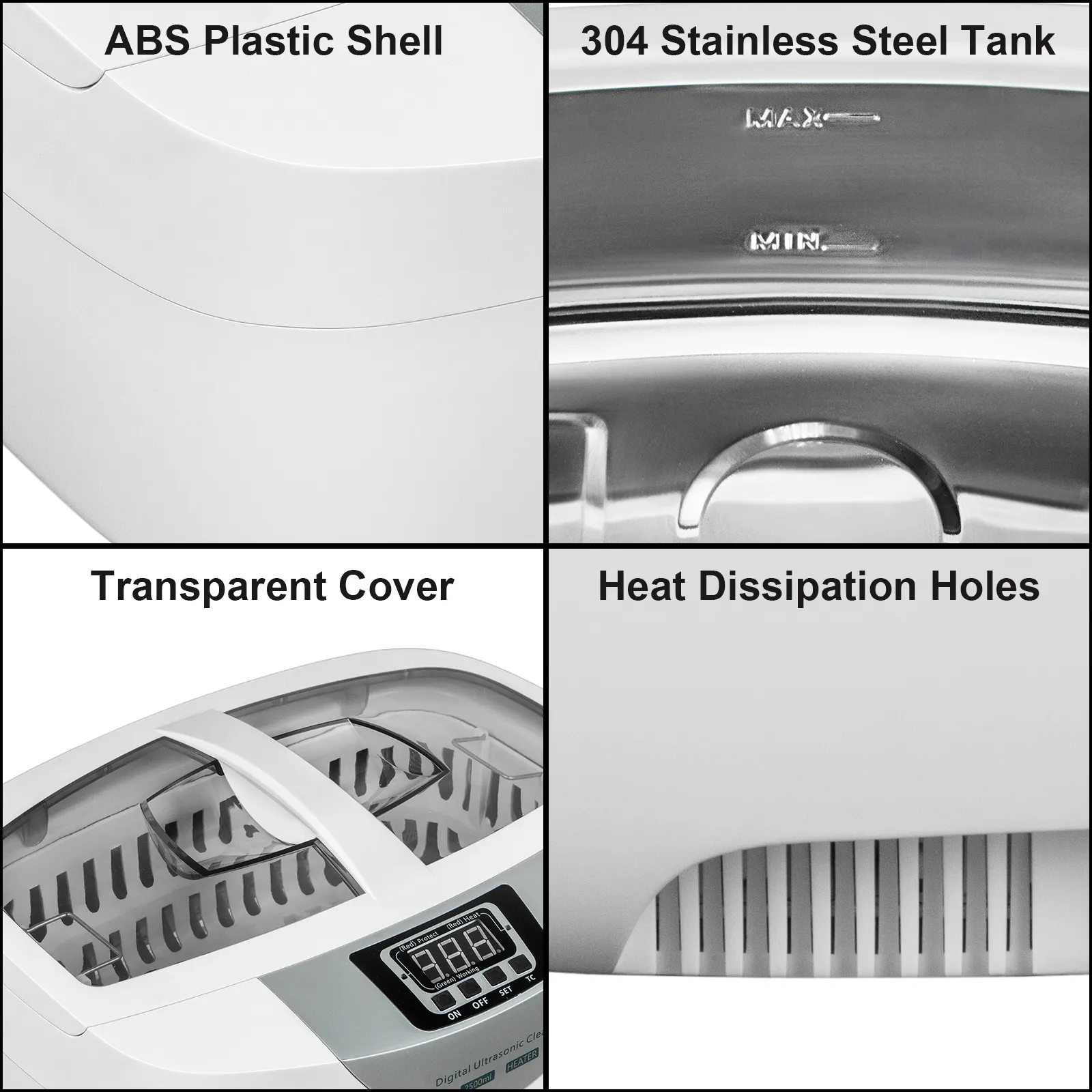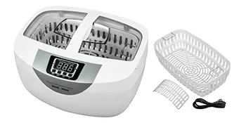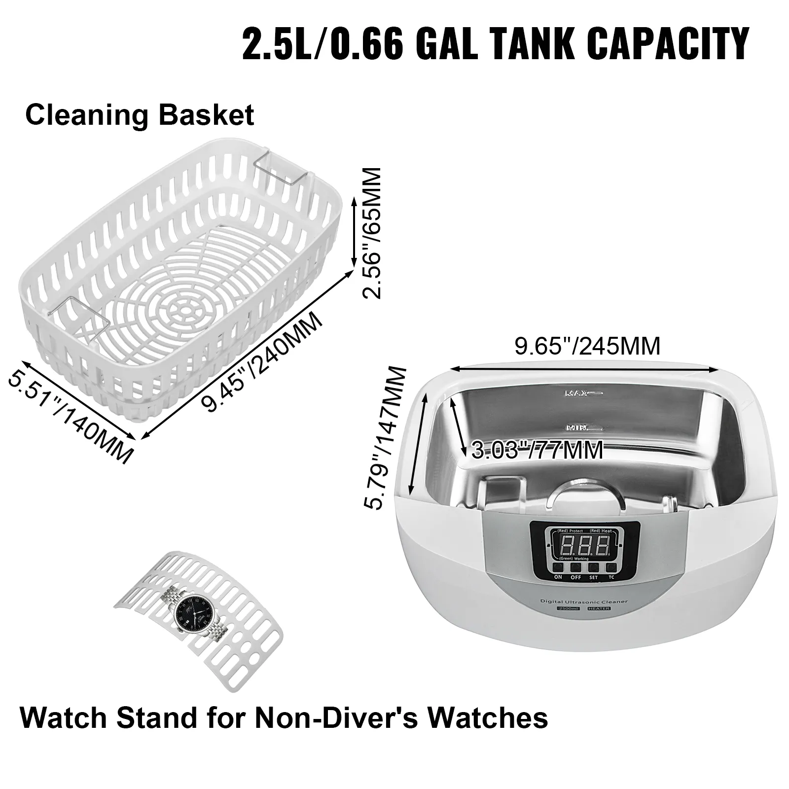 El limpiador de joyas sónico cuenta con un tanque de 2,5 l/0,66 gal, viene con una canasta de limpieza para reducir la fricción durante el lavado y un soporte para relojes que no se sumergen.