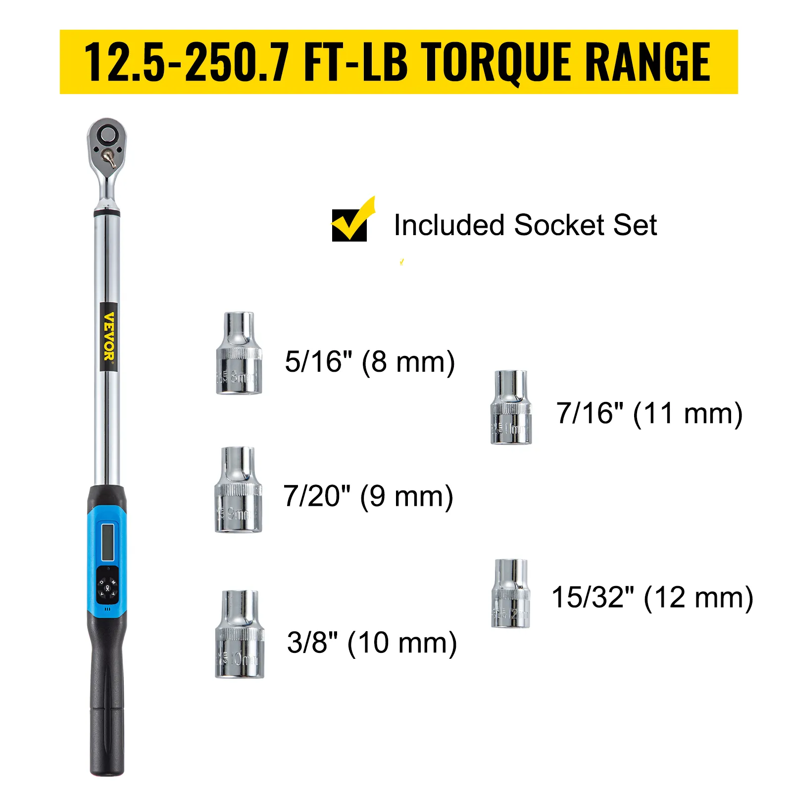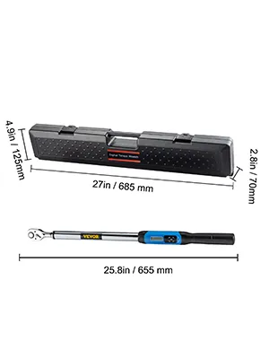 Conductor cuadrado: 1/2 pulgada. Rango de medición de torque: 12.5-250.7 ft-lbs/17-340 Nm . Precisión: en el sentido de las agujas del reloj ±2%; en sentido contrario a las agujas del reloj ±2,5%. mín. Escala: 0.1 ft-lb. La llave dinamométrica digital incluye 5 vasos.