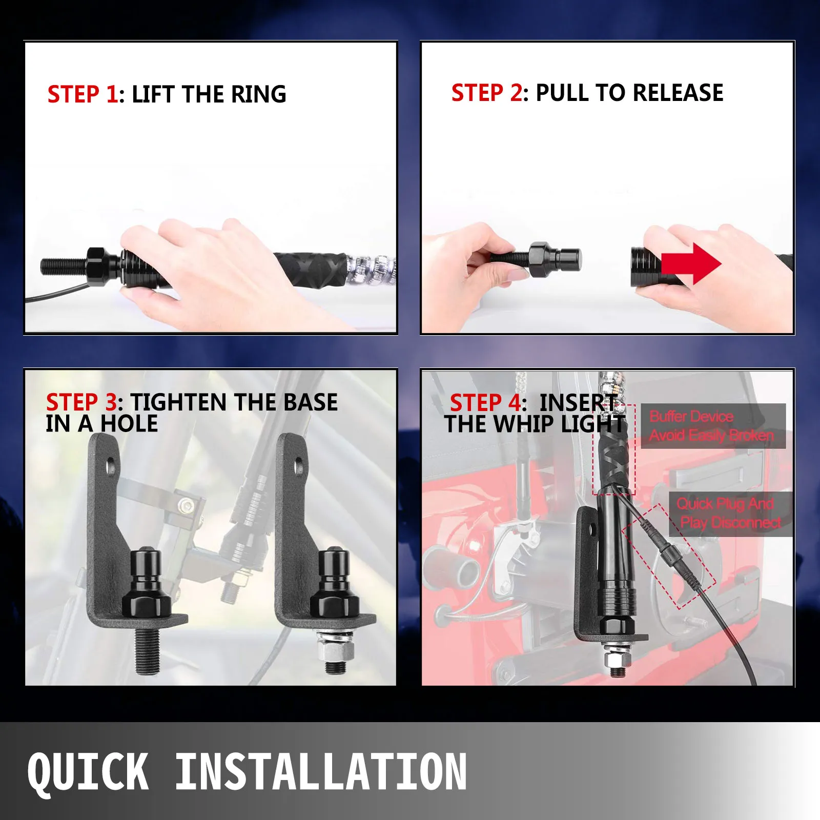 Con componentes Plug-n-Play fáciles de instalar, las luces de látigo LED para UTV son fáciles de instalar con la guía de instalación y los accesorios suministrados. Puede terminar fácilmente el montaje o desmontarlo también sin fatiga.