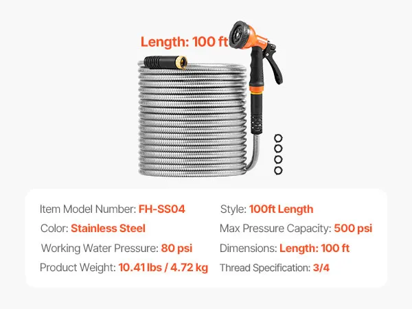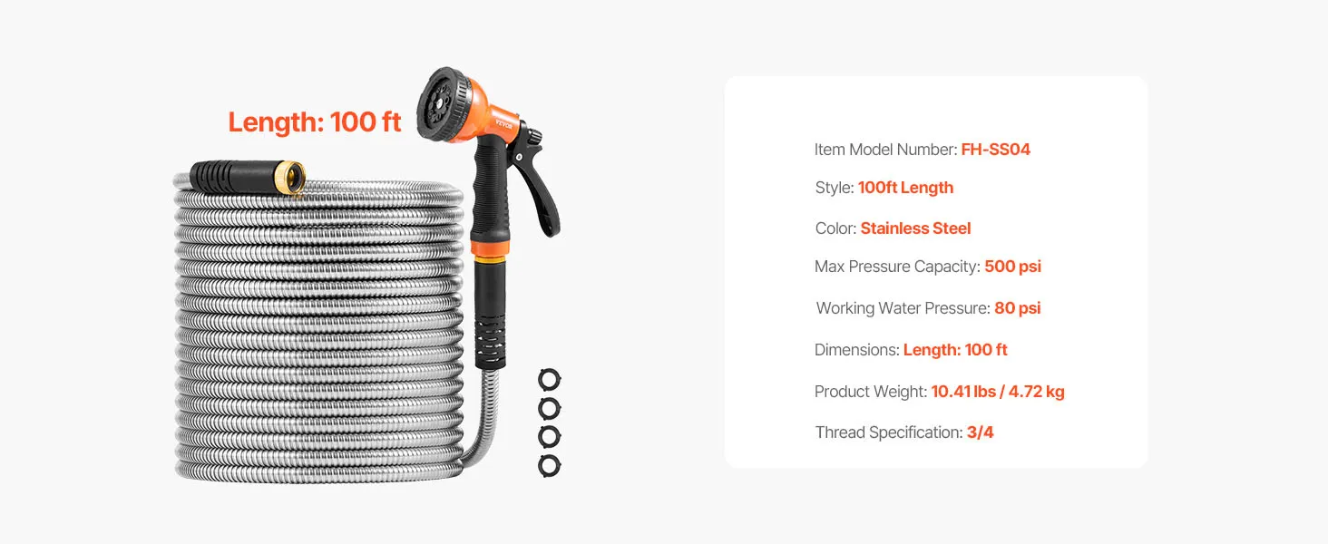 This stainless steel garden hose is durable, wear-resistant, and 20-30% lighter than rubber hoses for easy handling. Its kink-free design and 10-pattern spray nozzle suit all gardening and cleaning needs. Compatible with most faucets, it ensures quick installation and hassle-free use!
