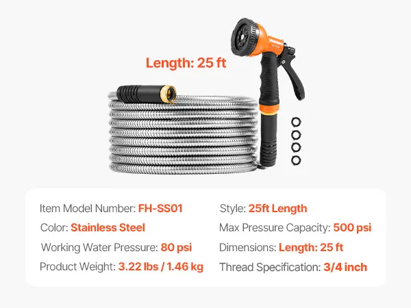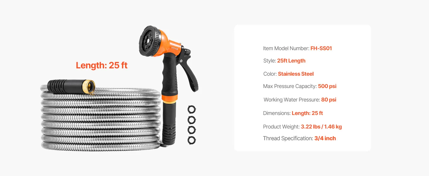 This stainless steel garden hose is durable, wear-resistant, and 20-30% lighter than rubber hoses for easy handling. Its kink-free design and 10-pattern spray nozzle suit all gardening and cleaning needs. Compatible with most faucets, it ensures quick installation and hassle-free use!