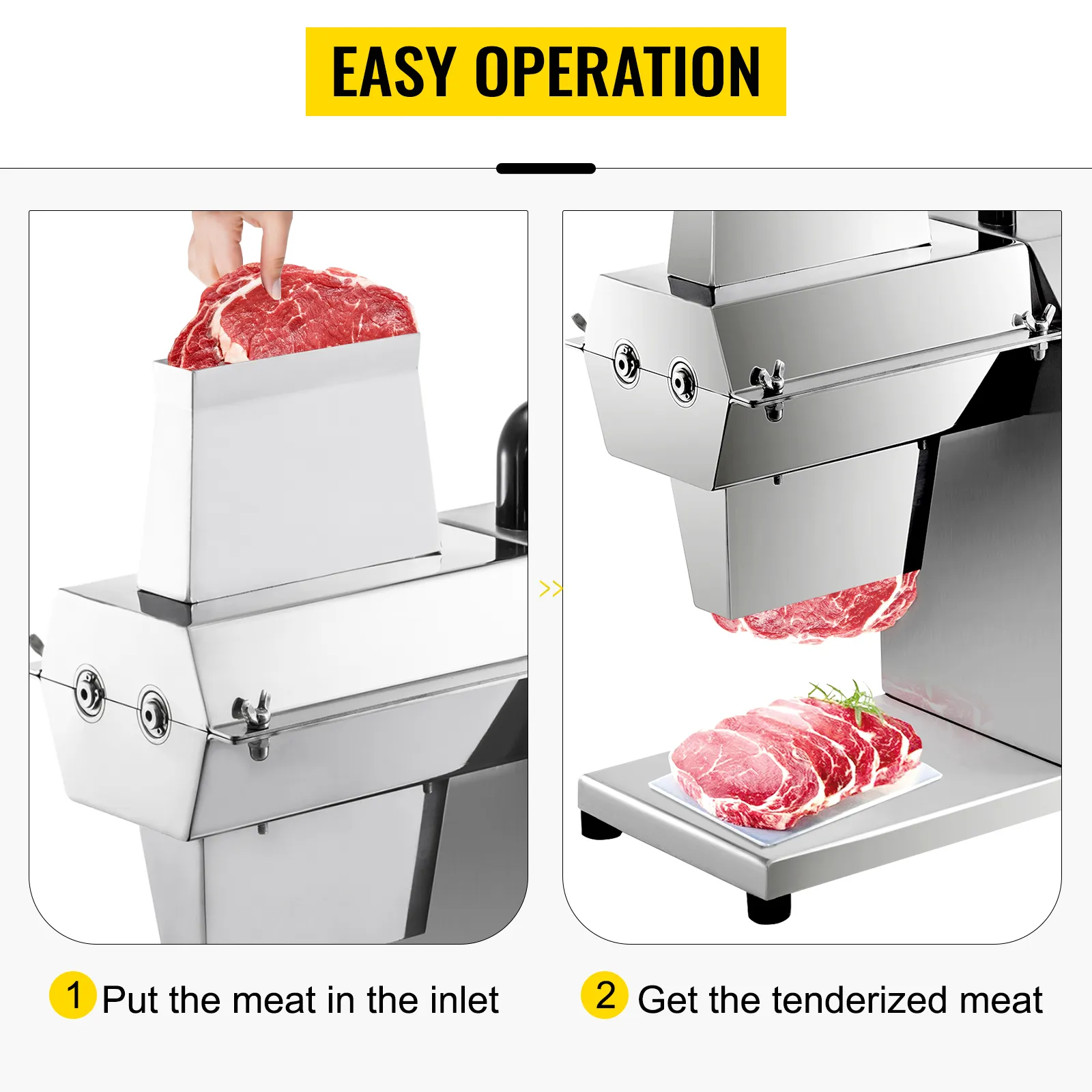 Abra la máquina con un clic, coloque la carne en la entrada de alimentación y podrá obtener la carne ablandada. Tamaño de entrada: 1 pulgada x 5 pulgadas. La entrada alargada facilita la colocación de la carne.