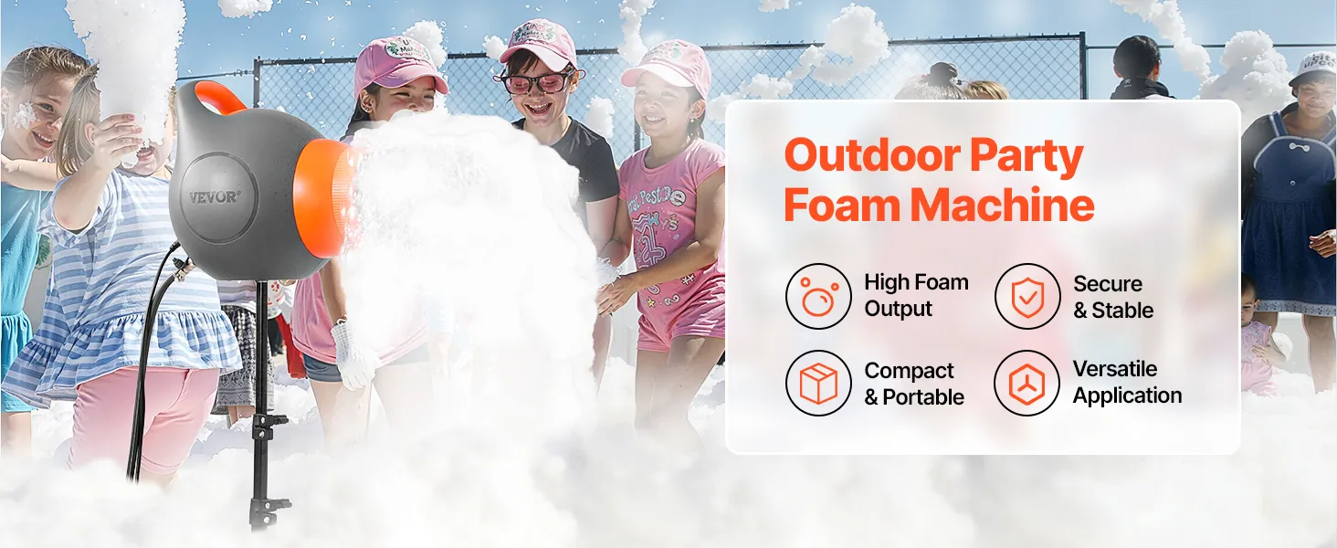 Esta máquina de espuma cuenta con un ventilador centrífugo impermeable para una producción continua. Funciona silenciosamente, es fácil de instalar y puede usarse con un trípode o colgada. ¡Ideal para cumpleaños, fiestas en la piscina y bodas!