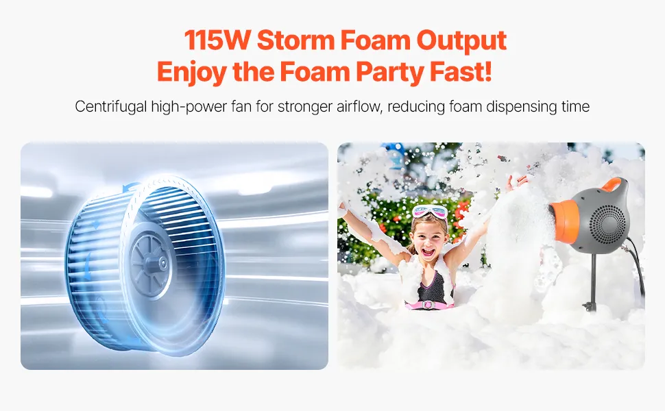 Gracias al ventilador centrífugo, nuestro cañón de espuma para fiestas aumenta la presión y la velocidad del aire, produciendo espuma rápidamente. ¡Tú y tus amigos se divertirán enseguida!