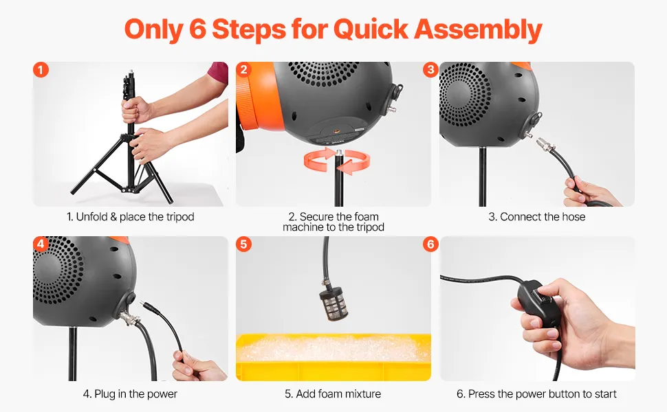 Con su diseño compacto y todos los accesorios necesarios, esta máquina para fiestas de espuma se monta en solo 6 sencillos pasos. ¡Conéctala y estarás lista para una fiesta llena de espuma!