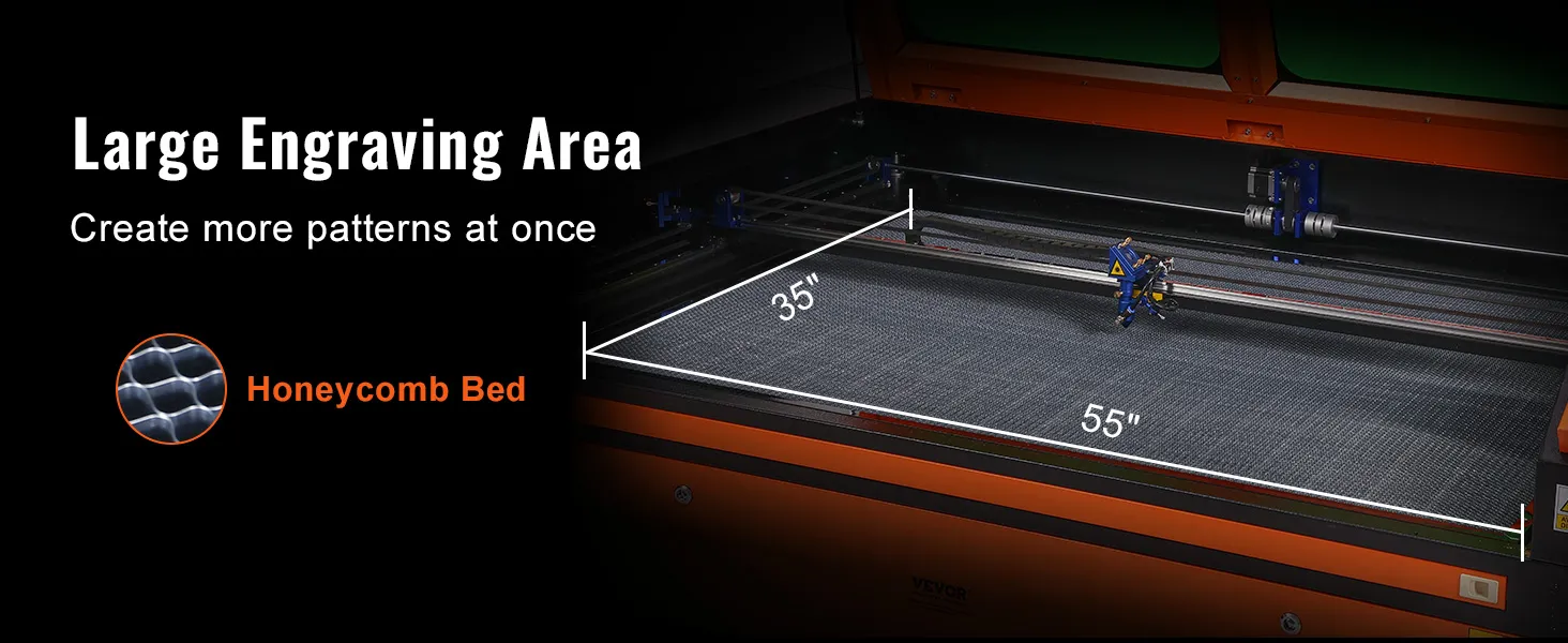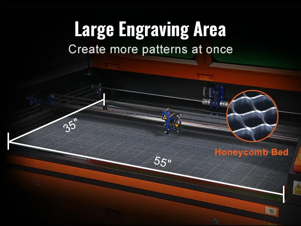 Área de trabajo de 35 x 55 pulgadas: ¿El espacio es un problema para usted? ¡Prepárese para trabajar cómodamente! Este grabador láser de CO₂ cuenta con una amplia área de trabajo de 35 x 55 pulgadas/900 x 1400 mm, lo que proporciona un generoso espacio de trabajo de 1925 pulgadas cuadradas para adaptarse a todos sus proyectos. La plataforma está diseñada con una estructura de panal para garantizar una alta estabilidad estructural. Sus puertas de paso delanteras y traseras abren aún más posibilidades.