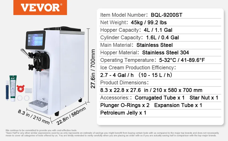 Máquina de helados comercial VEVOR, rendimiento de 10.6 qt/h, máquina de helado suave de un solo sabor para mostrador de 1000 W, tolva de 4 l, cilindro de 1.6 l, pantalla táctil con preenfriado y limpieza automática, para restaurante, cafetería