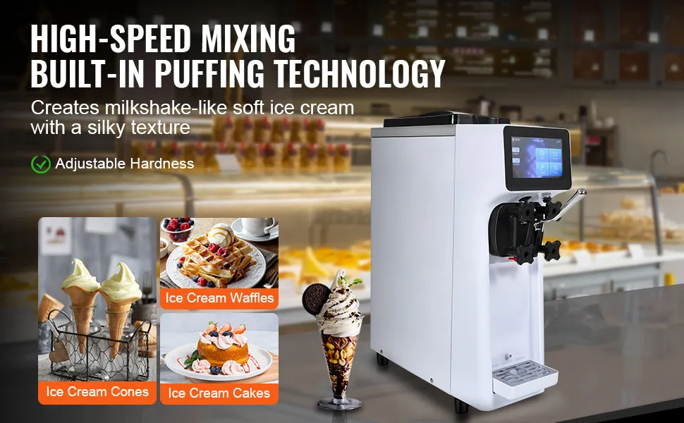 Aplicación versátil: Diseñada para ofrecer versatilidad, esta máquina de helado suave es ideal para crear una amplia variedad de delicias a base de helado, como conos, waffles y pasteles. Es el complemento perfecto para heladerías, cafeterías, bares y pequeños puestos de comida, realzando cualquier entorno comercial.