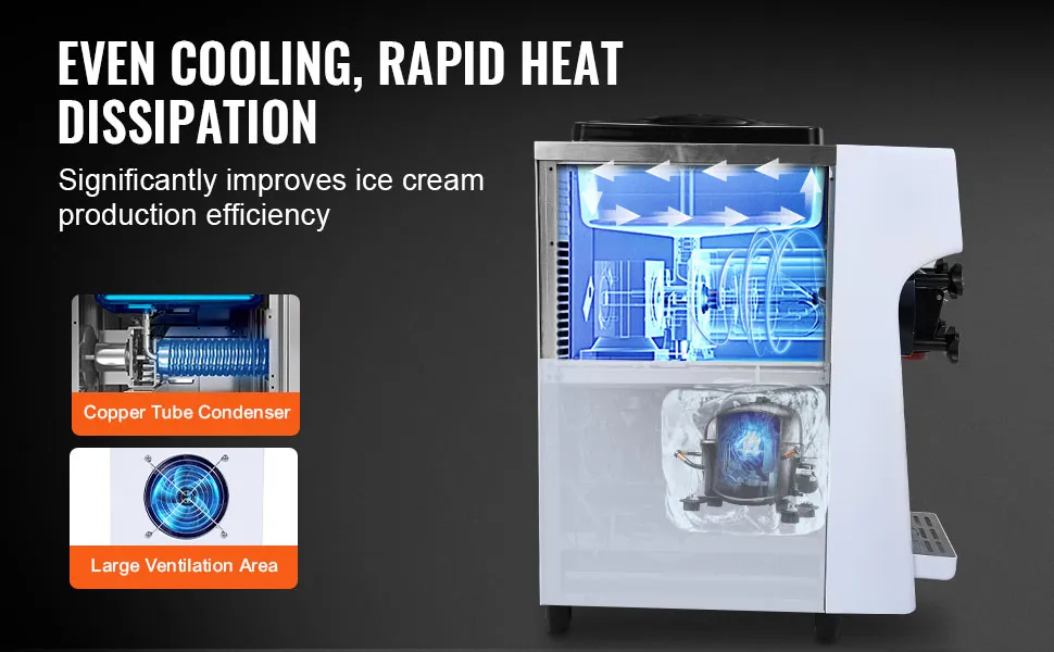 Equipado con un mecanismo de rotación de alta velocidad y un eficaz sistema de refrigeración, que incluye un condensador de tubo de cobre integrado y amplias ventilaciones laterales. Este diseño garantiza un enfriamiento uniforme y una disipación del calor, lo que favorece una textura y firmeza del helado consistentes.