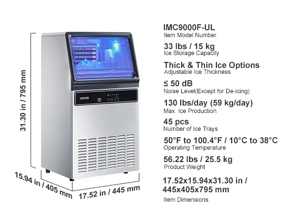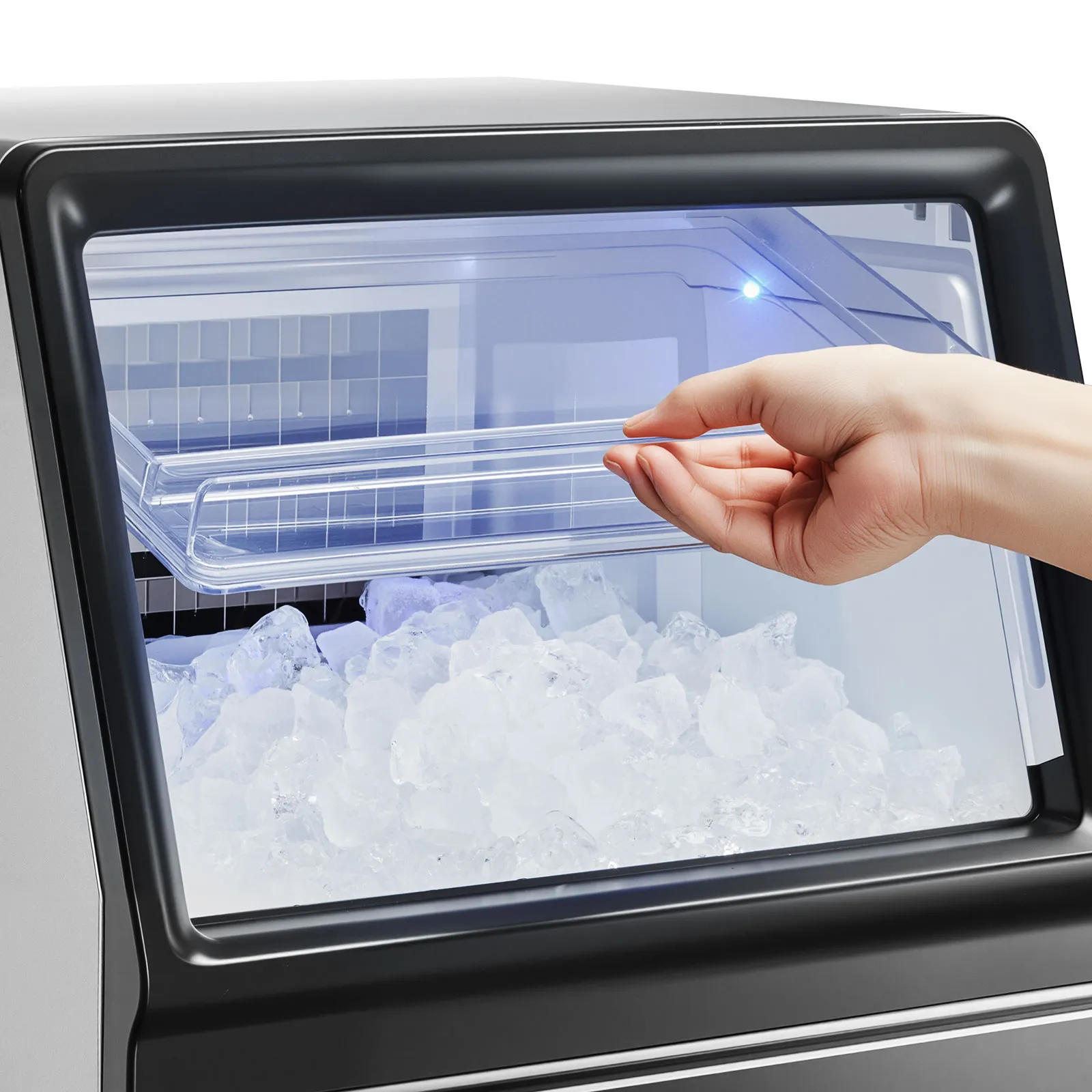 La máquina para fabricar hielo comercial produce hasta 60 kg de hielo cuadrado en 24 horas, con capacidad de almacenamiento de 15 kg. Con certificación ENERGY STAR y ETL, garantiza un rendimiento seguro y de bajo consumo. Cuenta con autolimpieza y temporizador para un uso diario sencillo, ideal para uso doméstico o para pequeñas necesidades comerciales.