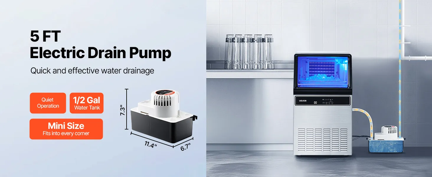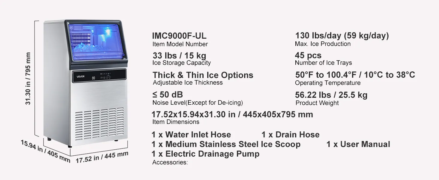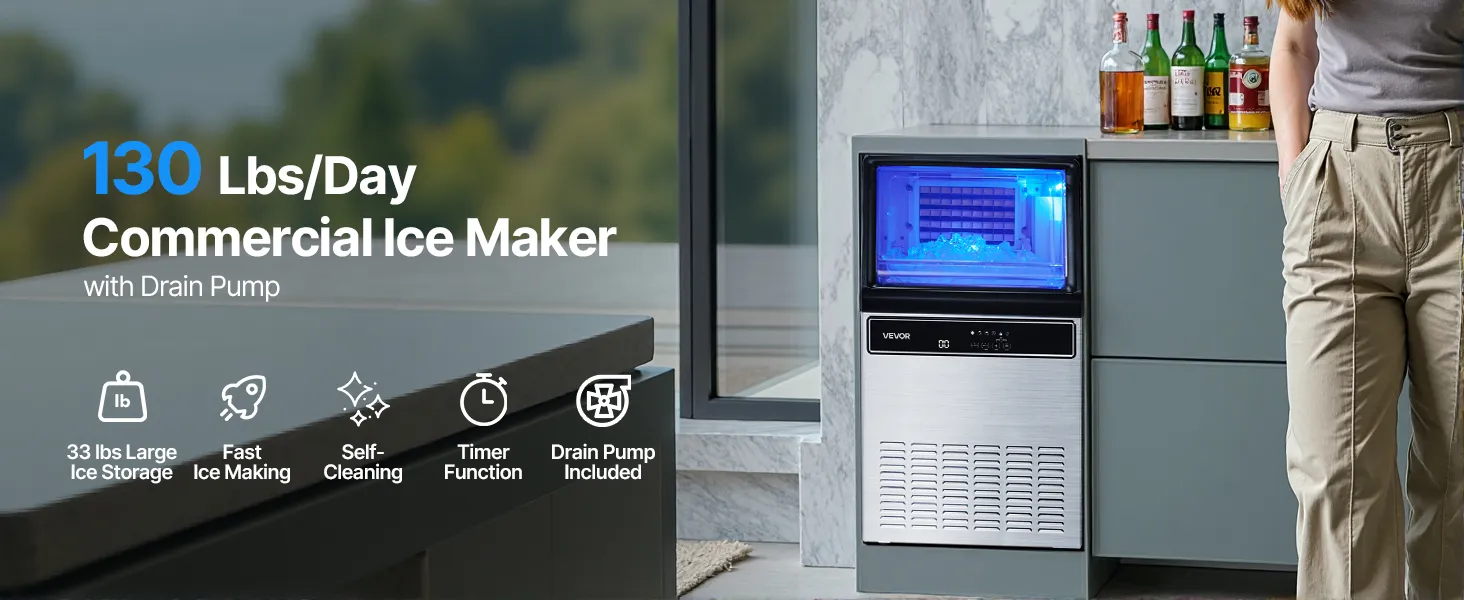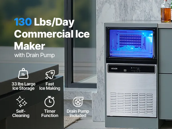 Máquina de hielo comercial VEVOR con bomba, 130 lb/24 h con capacidad de almacenamiento de 33 lb, 45 cubos por ciclo, máquina de hielo independiente y bajo encimera con pantalla LED y autolimpieza, para bar en casa o restaurante.