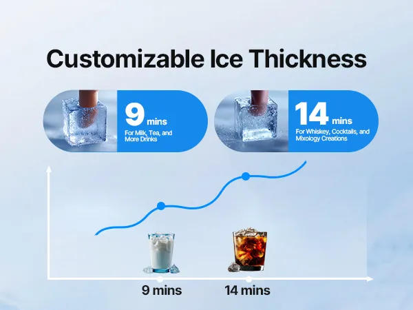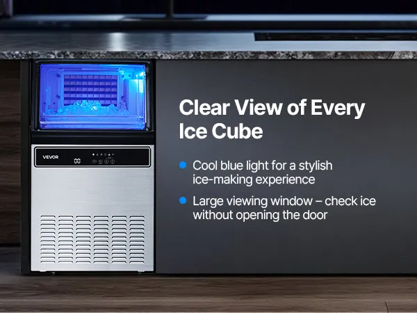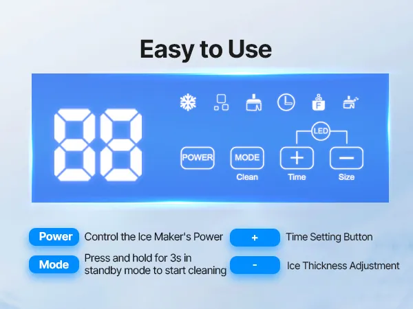 Fácil de usar: Esta máquina para hacer hielo cuenta con controles LED intuitivos; simplemente seleccione cubitos gruesos o delgados con un solo toque. La amplia ventana de visualización y la iluminación interior azul le permiten monitorear el proceso de fabricación de hielo sin abrir la tapa.