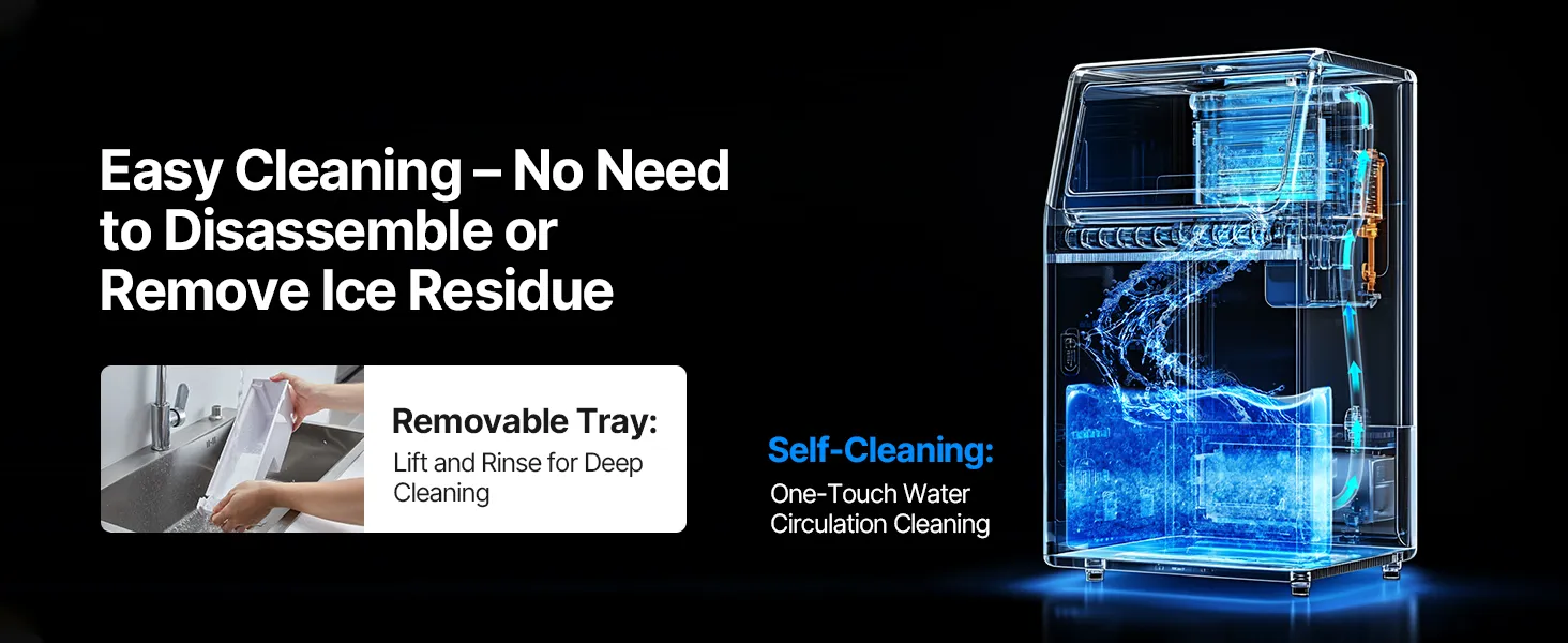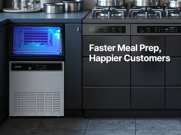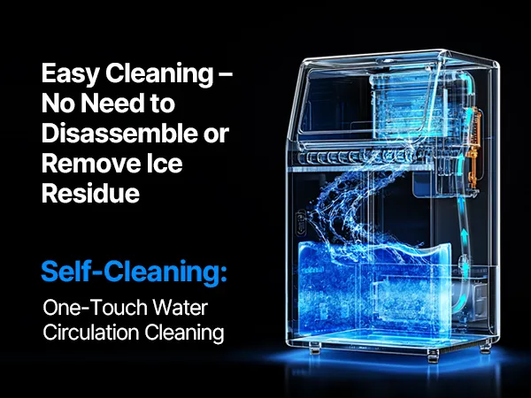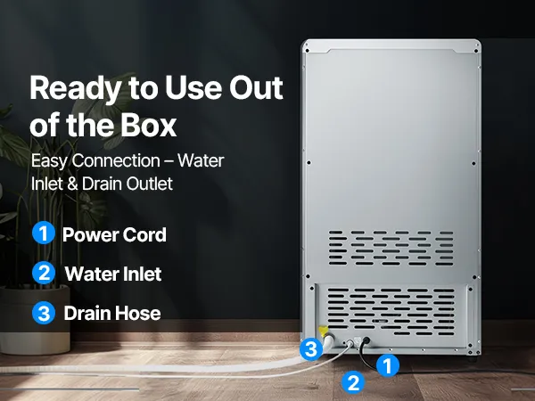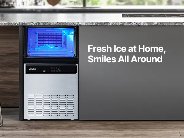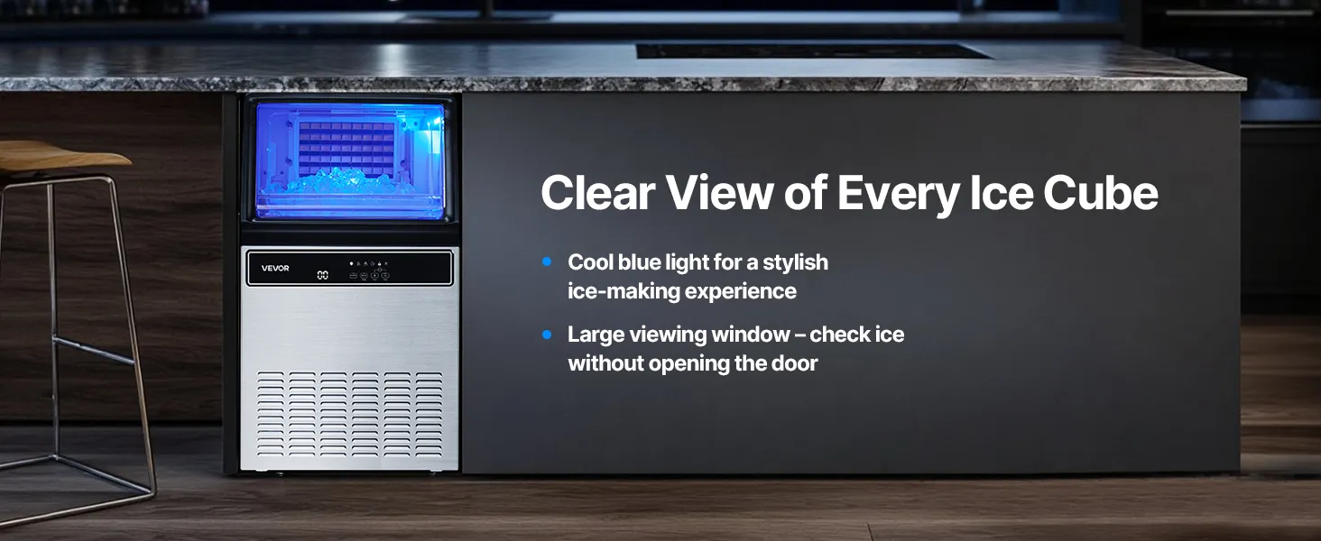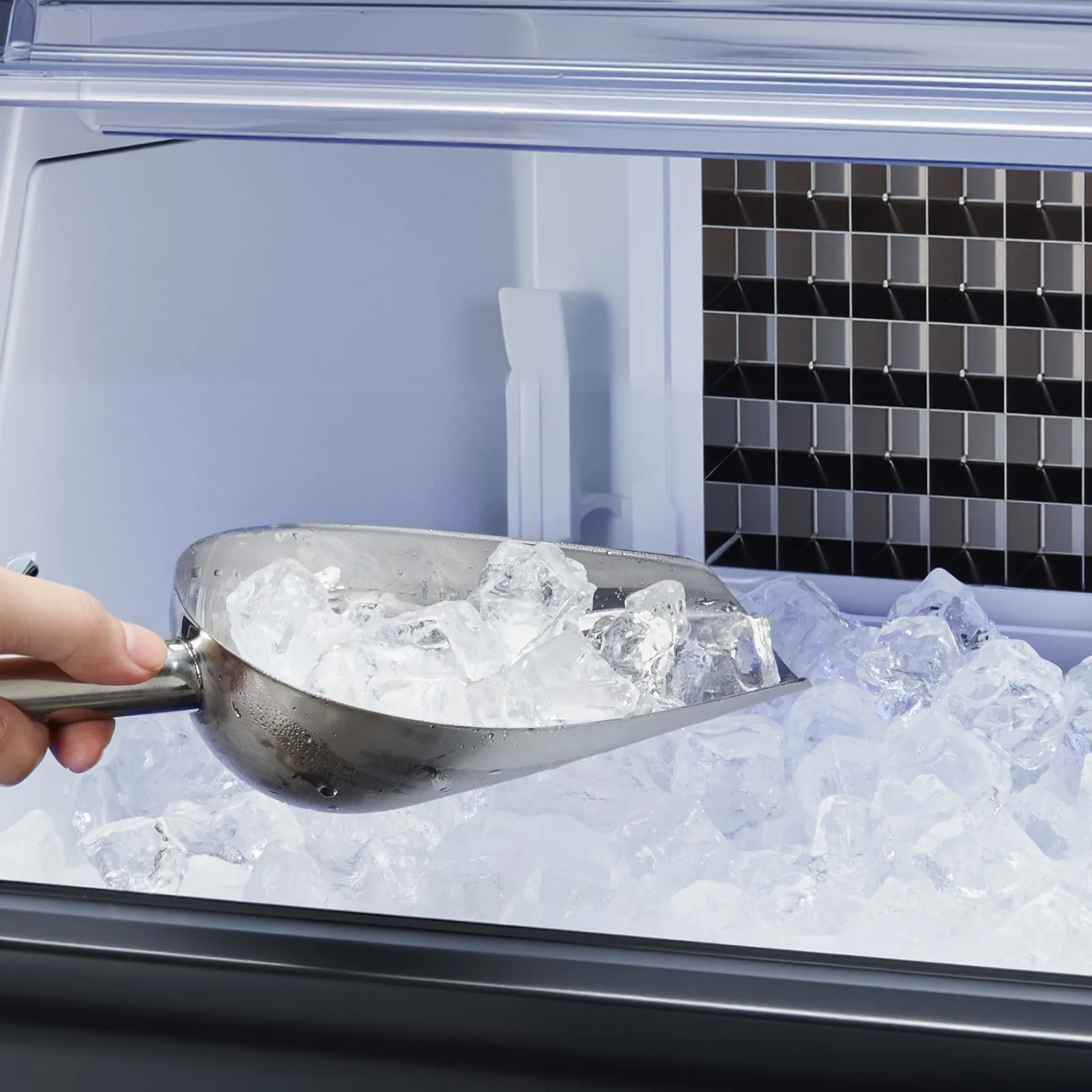 Instalación rápida: No requiere retirar la película; esta máquina de hielo bajo encimera está lista para usar. Independiente o empotrada, su elegante diseño se integra a la perfección en cocinas, bares o cualquier espacio que requiera una ubicación flexible.