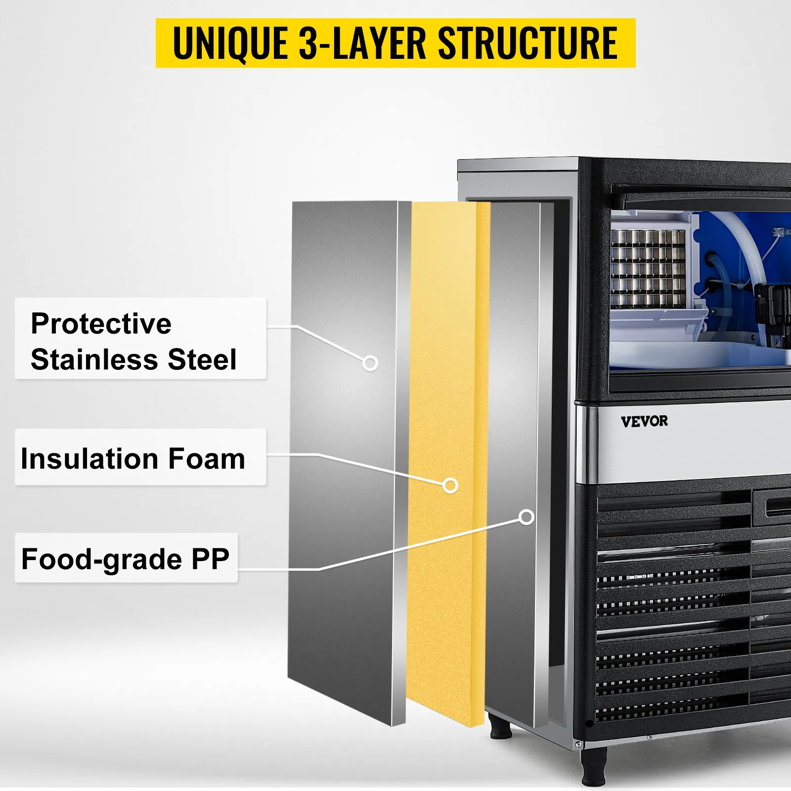 La máquina de hielo comercial de VEVOR se convierte en una herramienta esencial para hacer hielo rápidamente en interiores y exteriores, decorar sus alimentos y bebidas y enfriar el calor abrasador del verano.