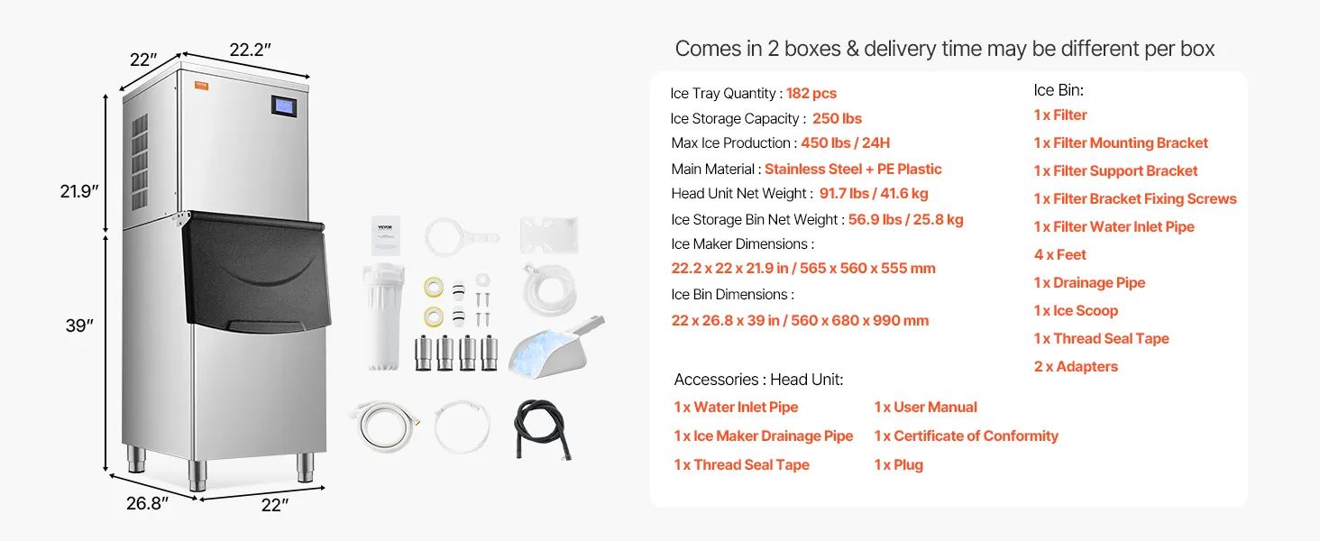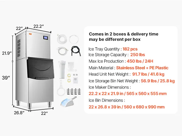 Gran producción de hielo: esta máquina de hielo comercial puede producir 450 libras de hielo por 24 horas, con una gran capacidad de 250 libras y un excelente aislamiento, lo que garantiza un suministro continuo de hielo.
