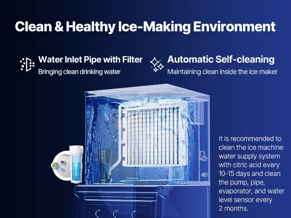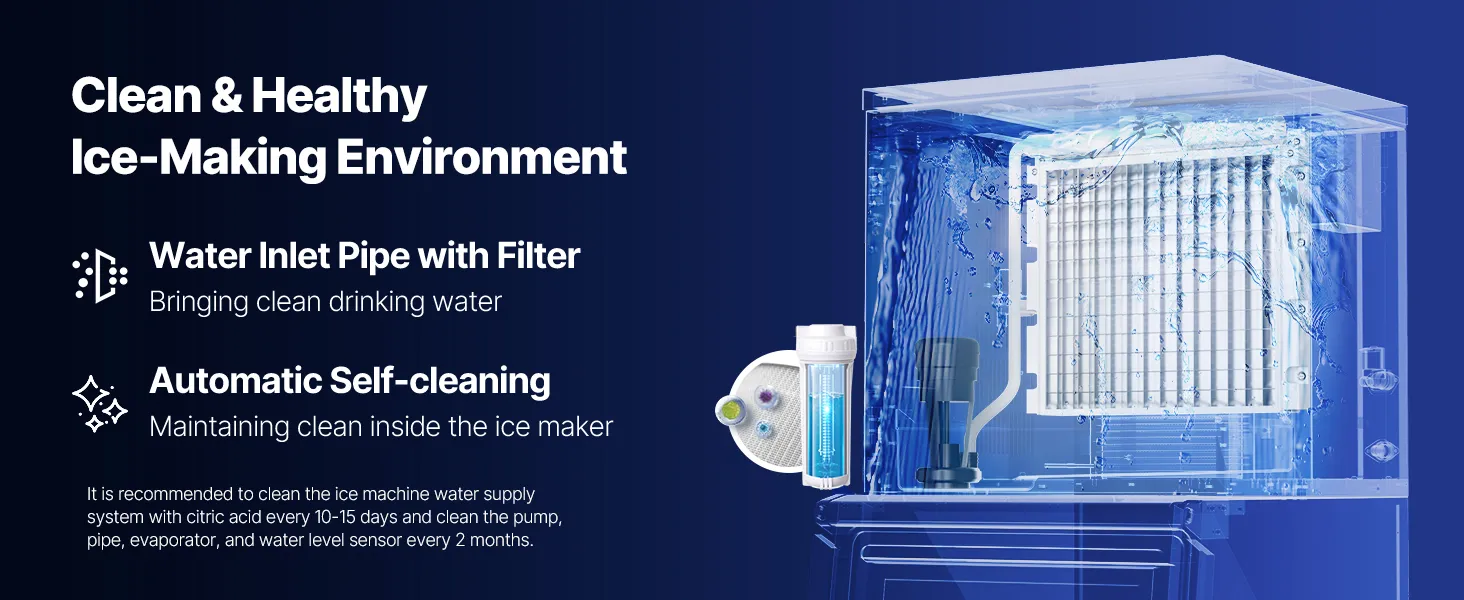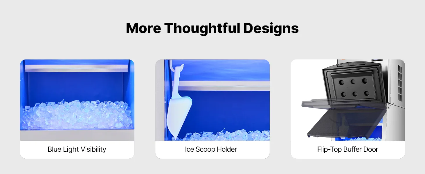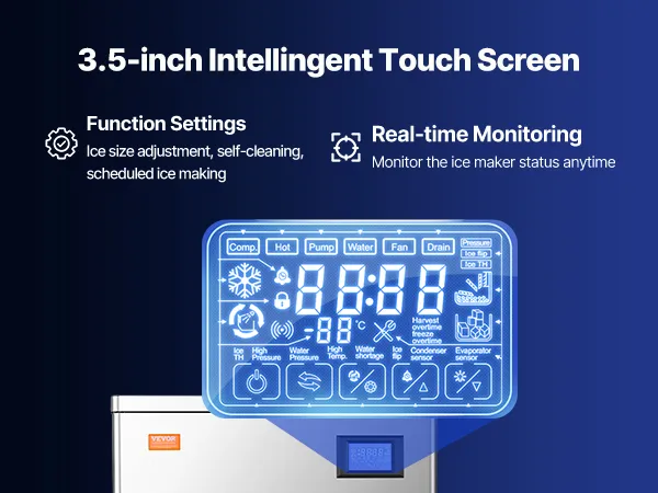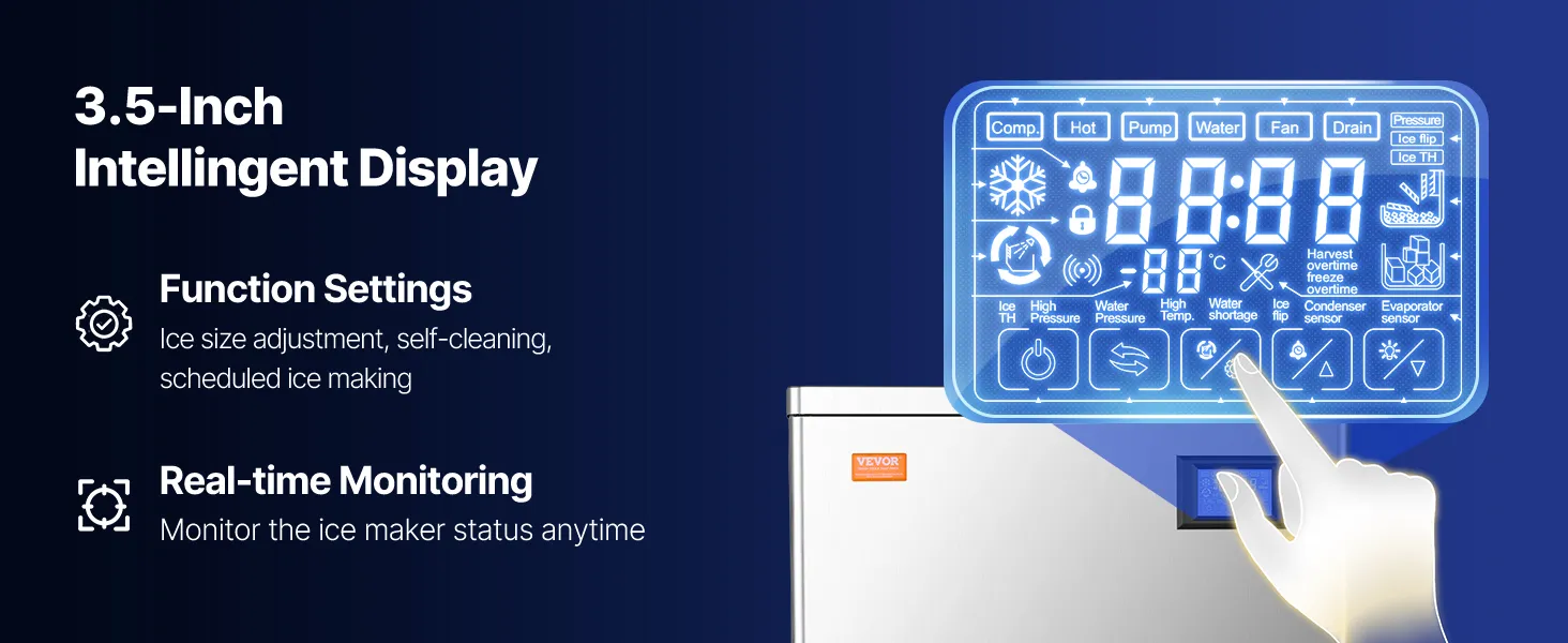 Panel de control inteligente: la pantalla táctil inteligente le permite ajustar el grosor del hielo y activar la función de autolimpieza con facilidad. Las luces indicadoras del panel brindan actualizaciones del estado de la máquina de hielo en tiempo real.