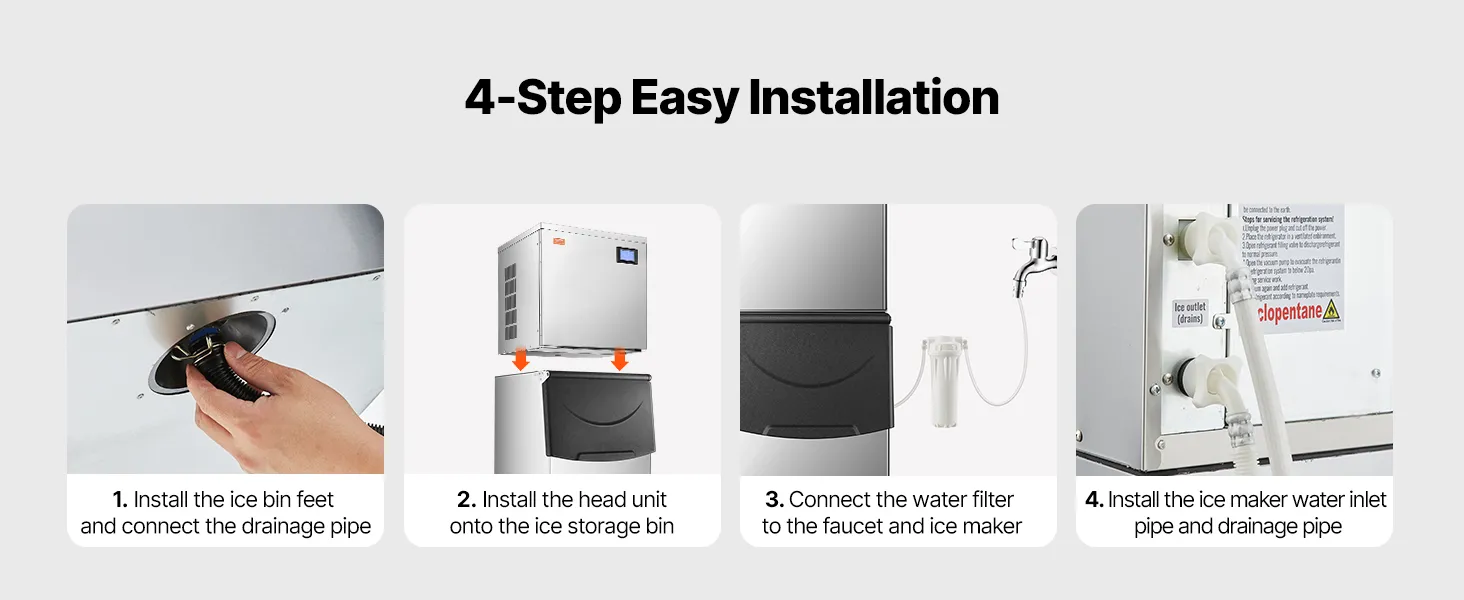 Fácil de limpiar: la máquina para fabricar hielo comercial cuenta con una función de autolimpieza de un solo toque, lo que le proporciona un entorno de fabricación de hielo limpio y saludable y garantiza que los cubitos de hielo estén limpios.