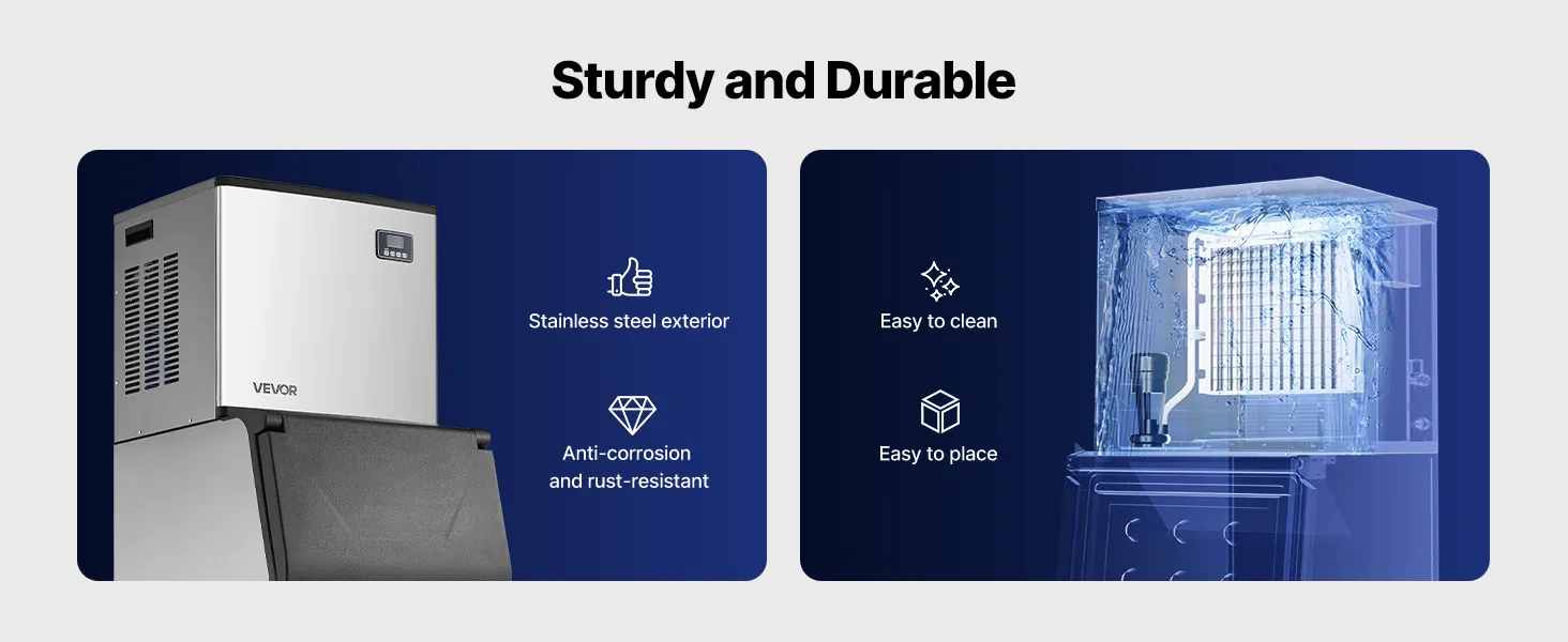 La máquina para fabricar hielo comercial cuenta con una carcasa de acero inoxidable refinada, que es resistente al óxido y la corrosión, fácil de limpiar y muy duradera.