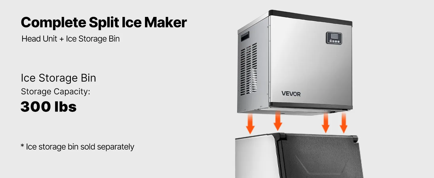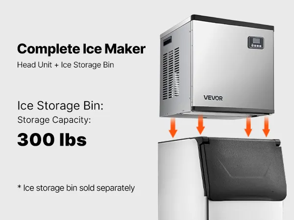 La unidad principal y el depósito de hielo se combinan para formar una máquina de hielo comercial completa. Ofrecemos una configuración con depósito de hielo de 136 kg (300 lb), que se vende por separado.