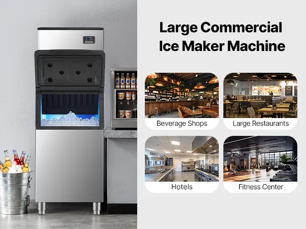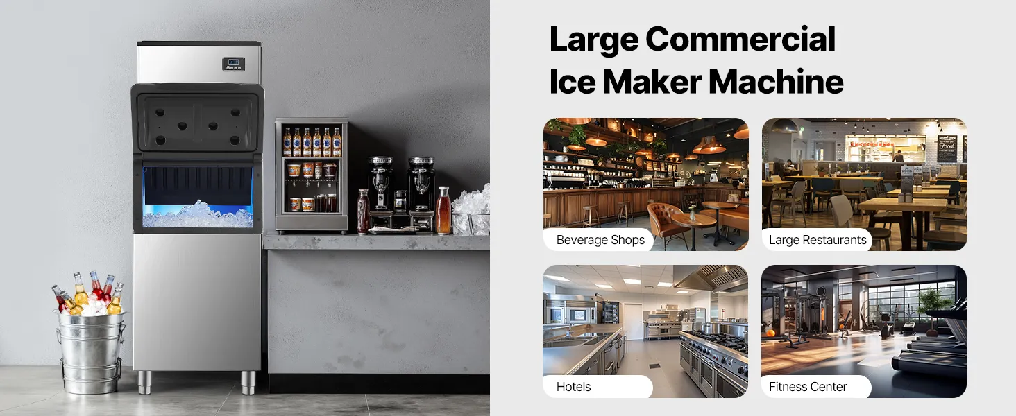 La máquina de cubitos de hielo proporciona una gran producción de hielo, lo que la hace ideal para cocinas comerciales, restaurantes, bares, hoteles y tiendas de bebidas.