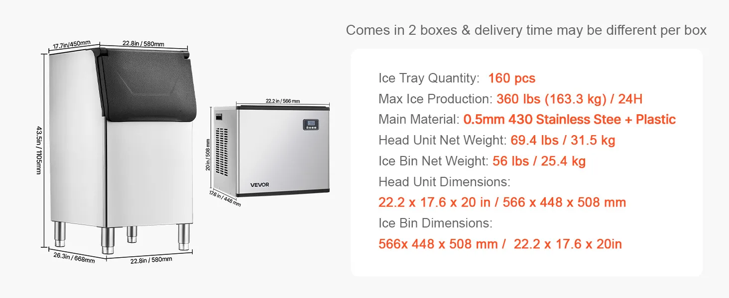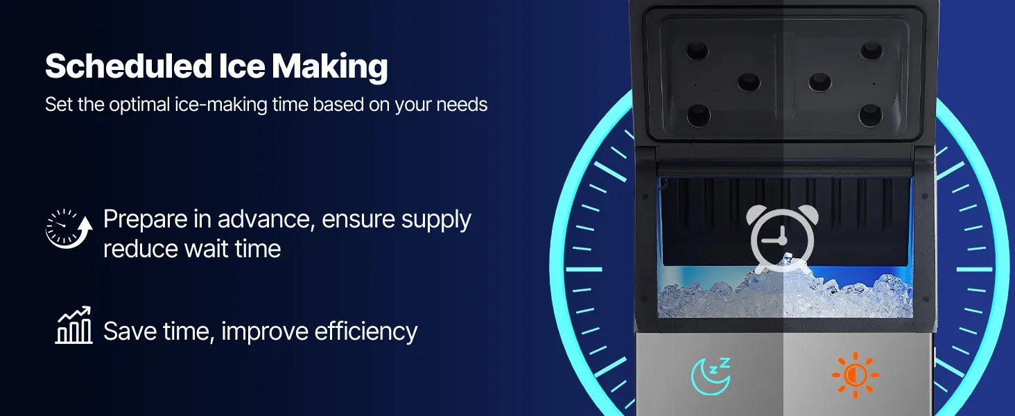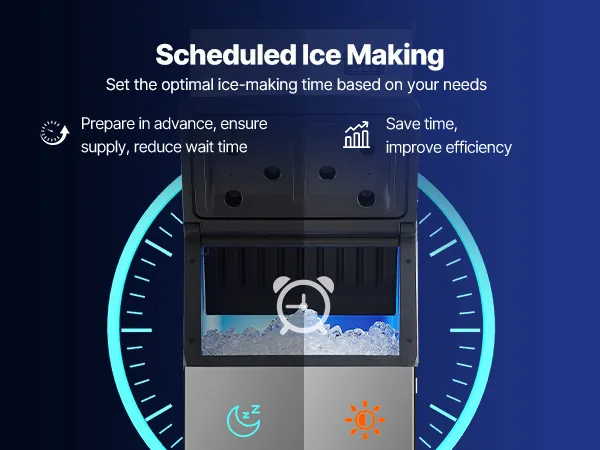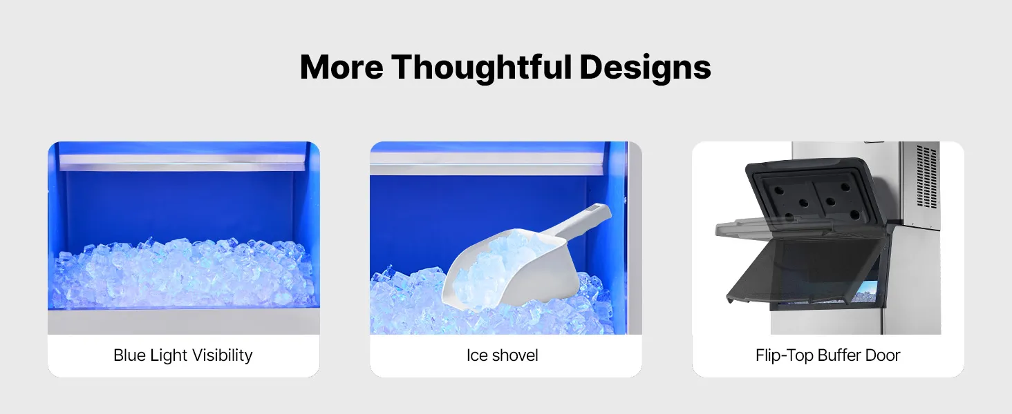 Fabricación rápida de hielo: Equipada con 160 bandejas de hielo, la máquina de hielo permite ajustar el grosor del hielo modificando el tiempo de fabricación. El potente compresor puede producir hielo en 12-15 minutos.