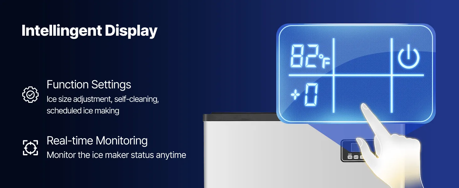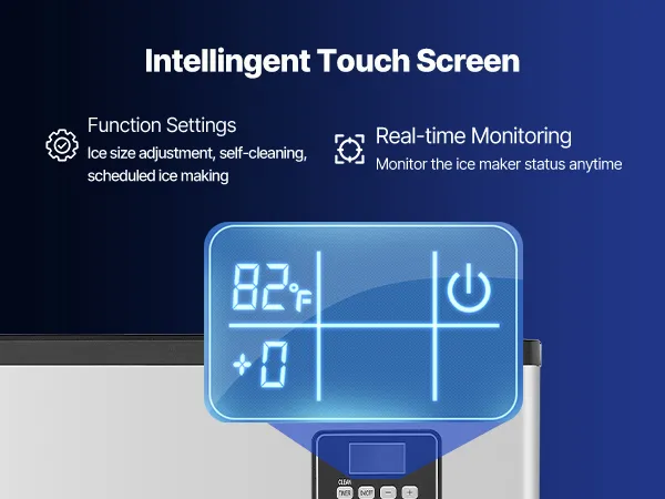 Panel de control inteligente: La pantalla táctil inteligente permite ajustar el grosor del hielo y activar la función de autolimpieza fácilmente. Las luces indicadoras del panel informan sobre el estado de la máquina de hielo en tiempo real.