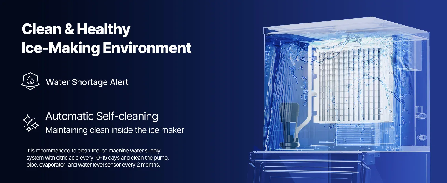 Fácil de limpiar: la máquina para fabricar hielo comercial cuenta con una función de autolimpieza de un solo toque, lo que le proporciona un entorno de fabricación de hielo limpio y saludable y garantiza que los cubitos de hielo estén limpios.