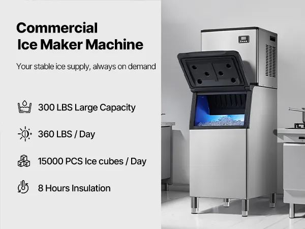 Gran producción de hielo: Esta máquina de hielo comercial puede producir 360 libras de hielo por 24 horas, con una gran capacidad de 300 libras y un excelente aislamiento, lo que garantiza un suministro continuo de hielo.
